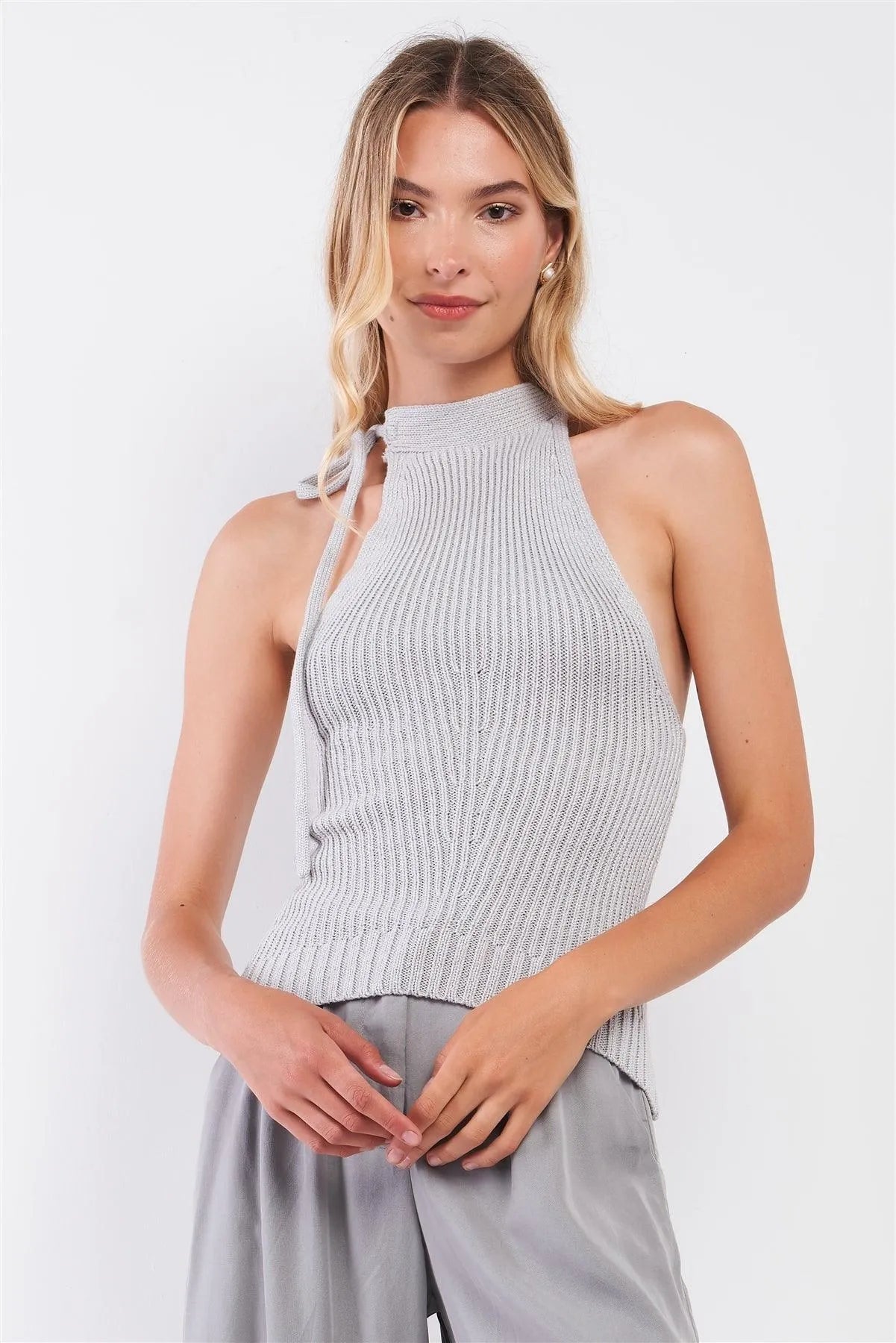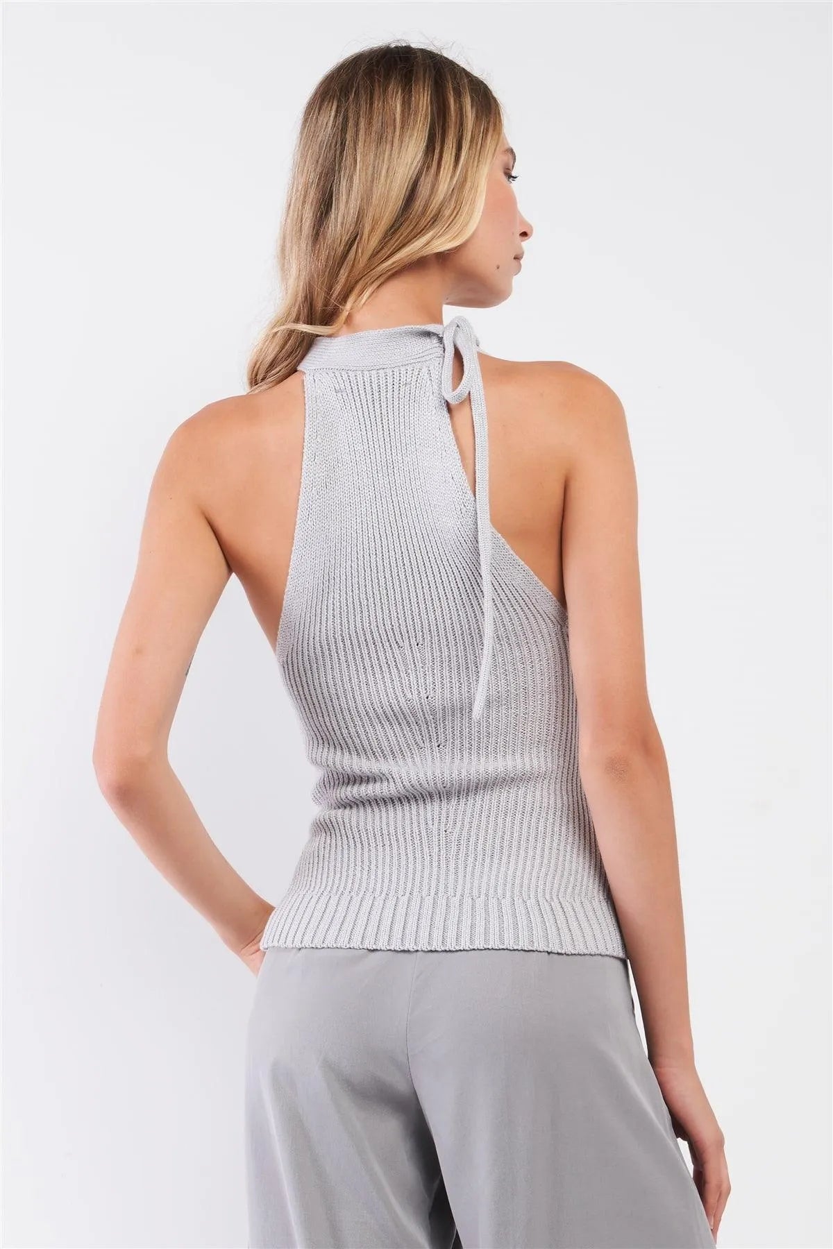 🖤 Item features: Silver grey, solid color, knit construction, ribbed, high neckline with self-tie detail on the side, sleeveless, fitted, stretchy, sexy, elegant, fall/winter collection