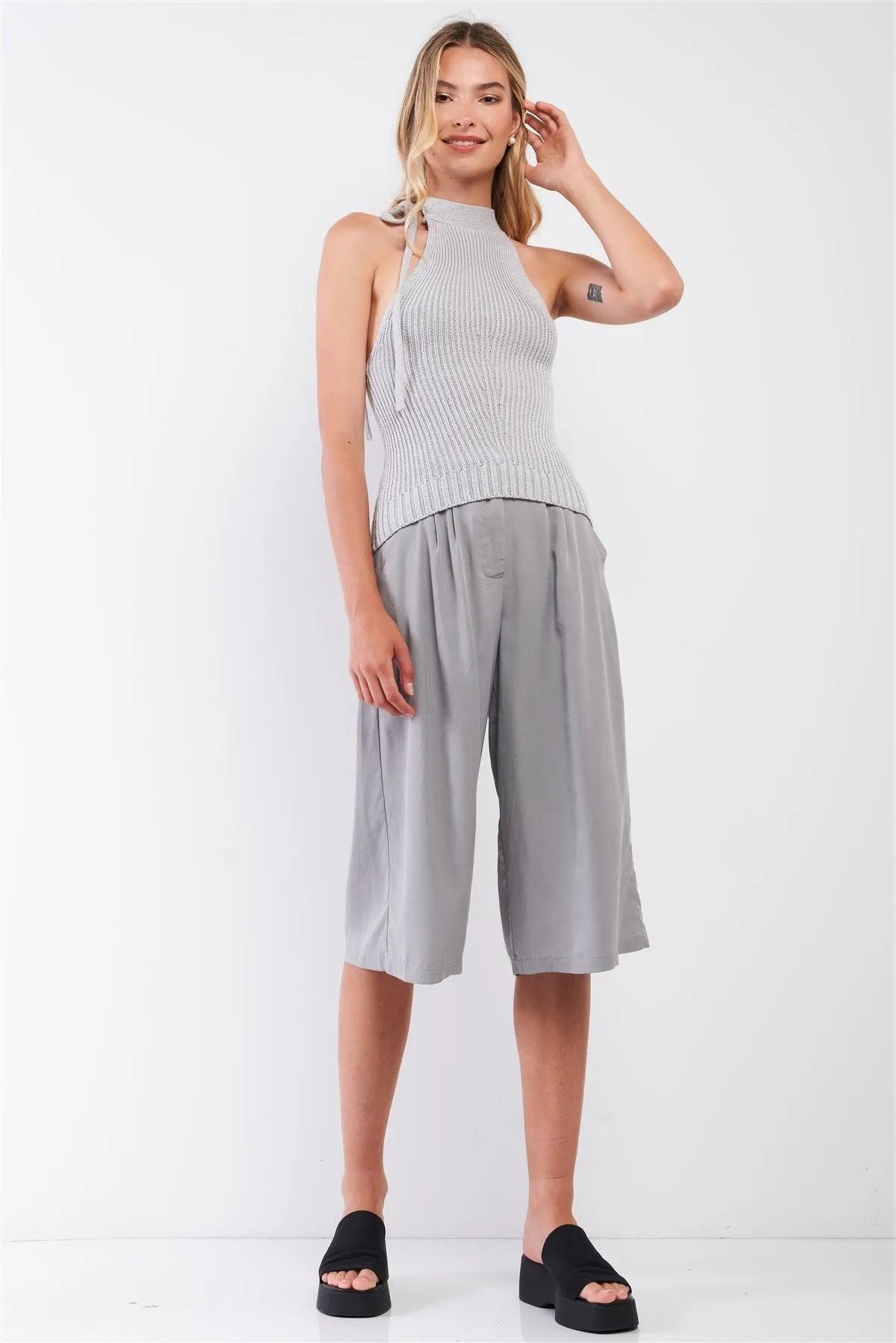 Silver Grey High Neck With Self-Tie Detail On The Side Sleeveless Ribbed Knit Top /3-2-1