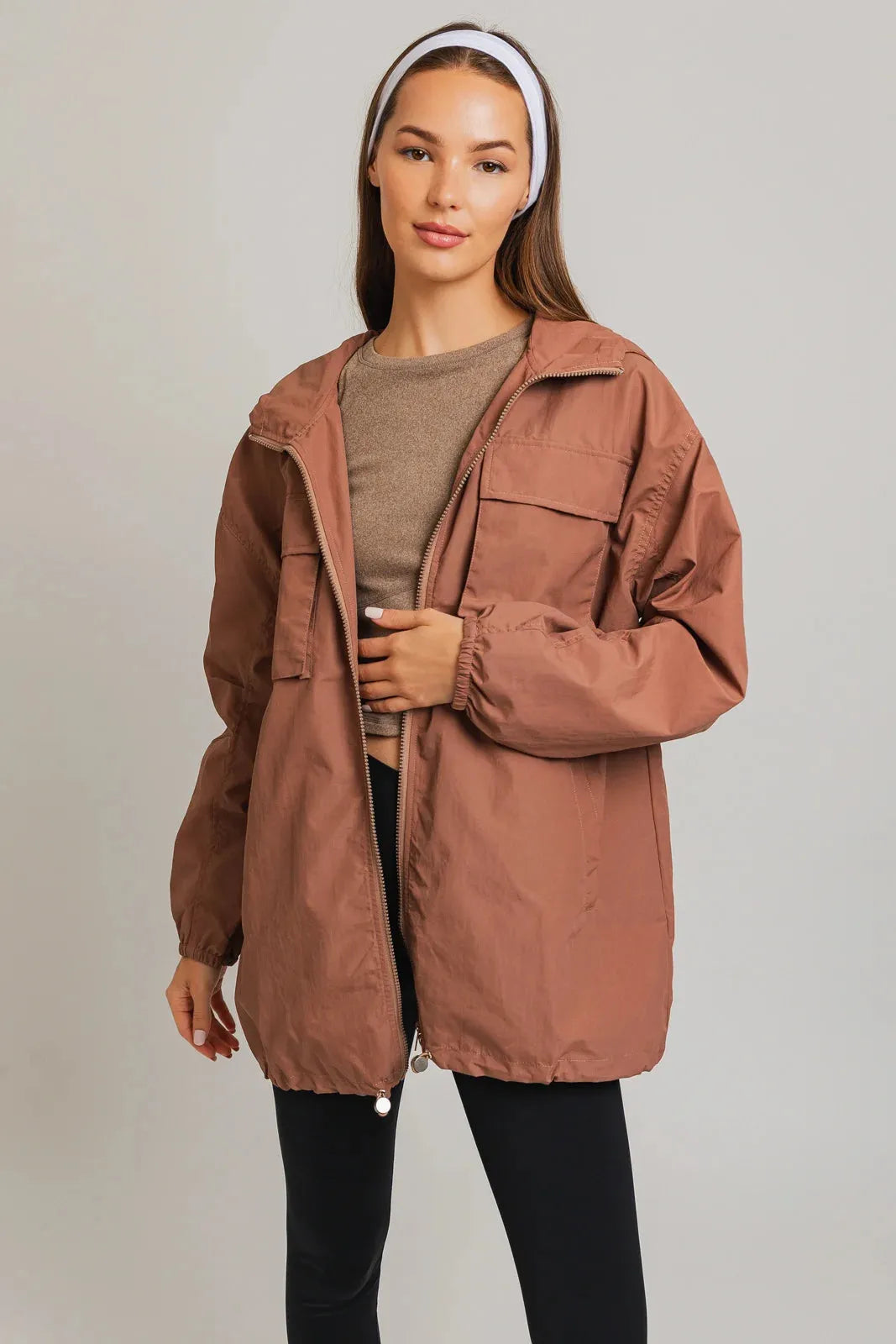 Oversized Front Pocket Drawstring Nylon Windbreaker