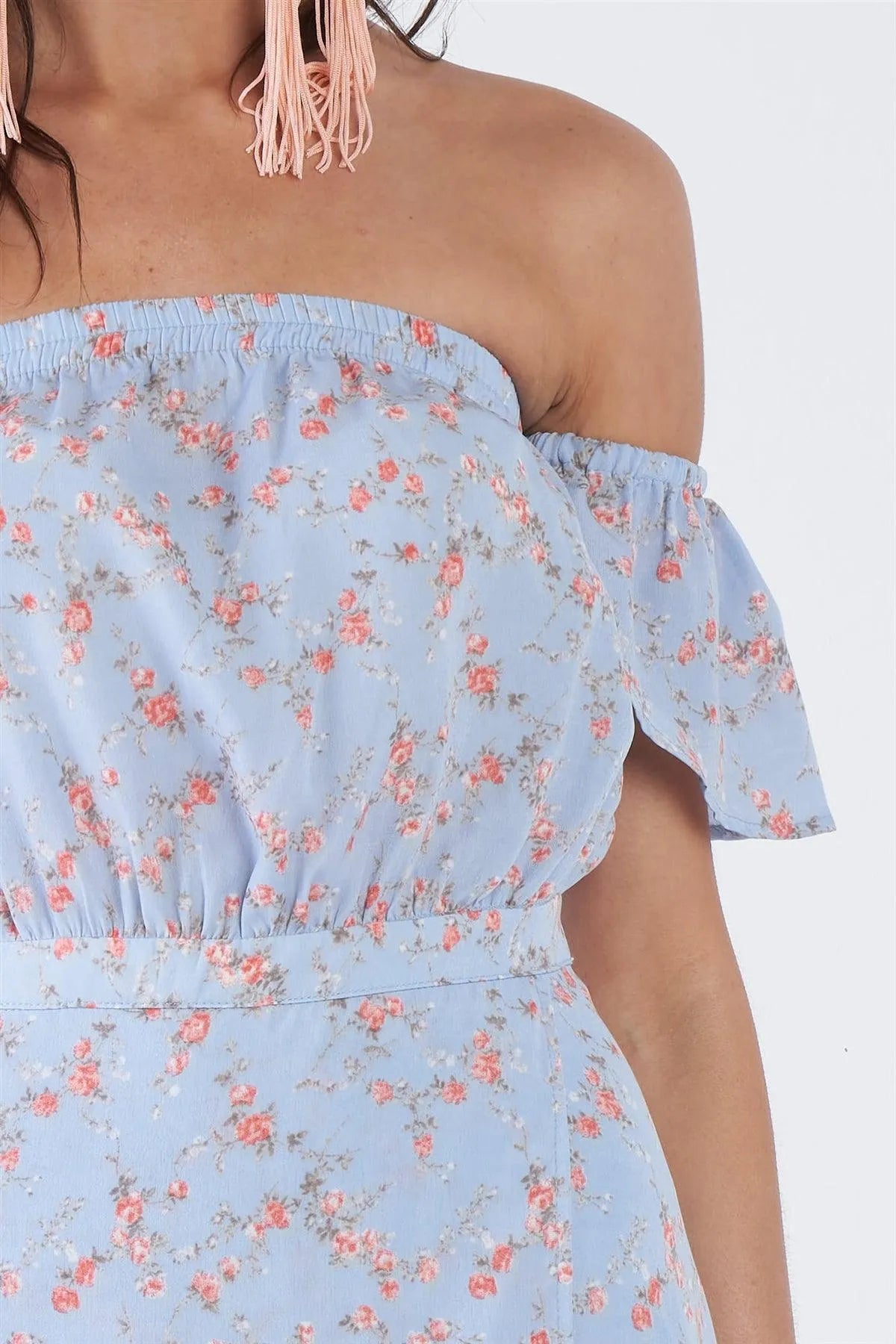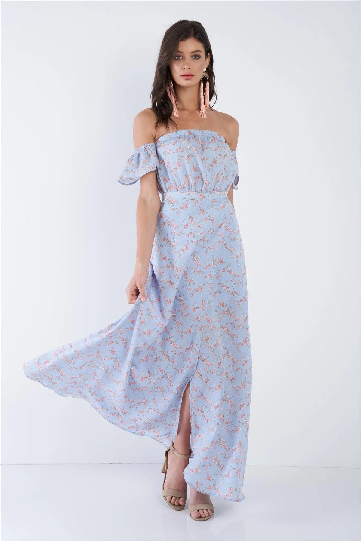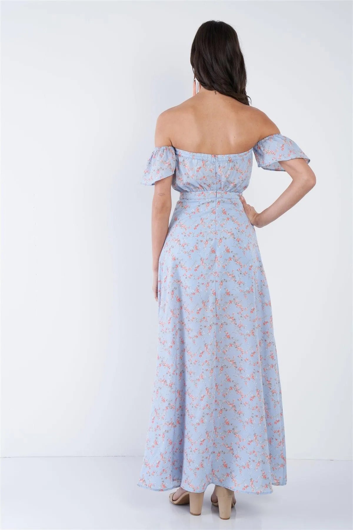 Sky Blue Boho Floral Off-The-Shoulder Maxi Dress /3-2-1