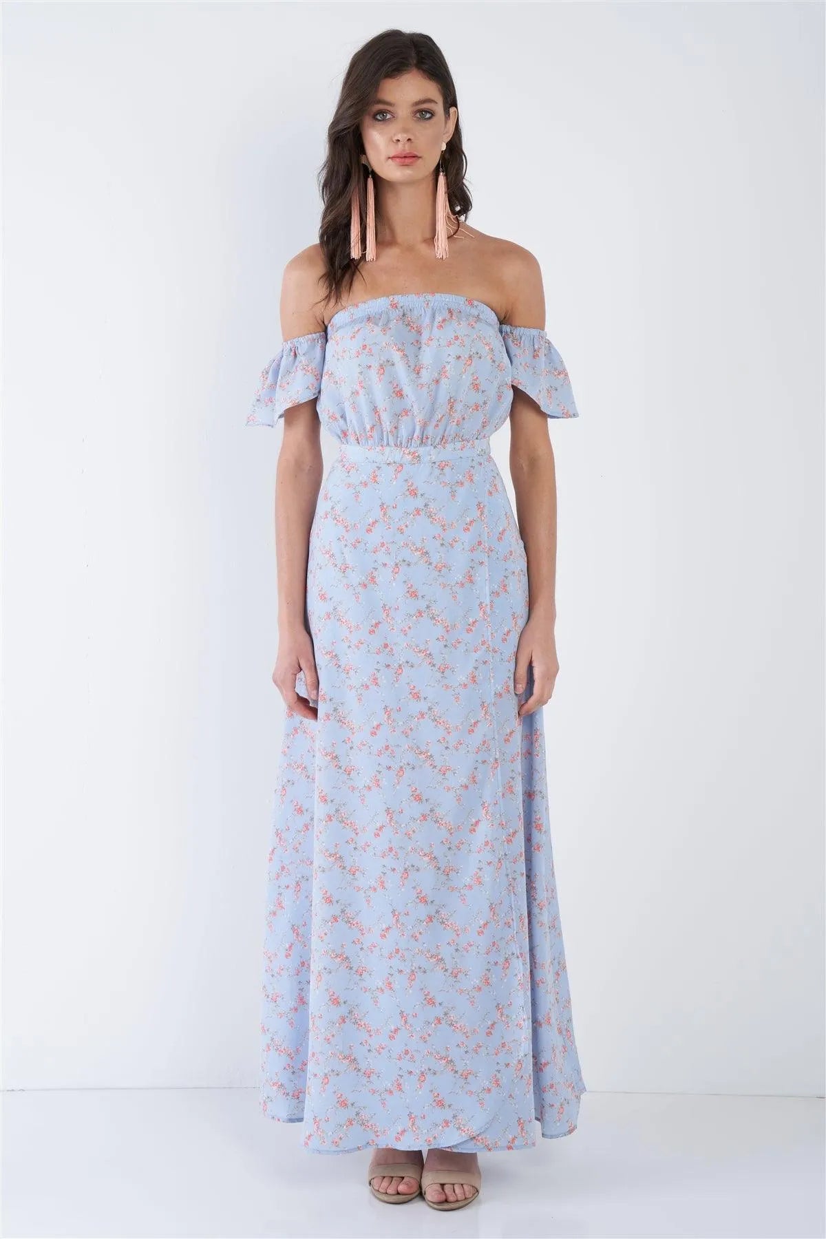 Sky Blue Boho Floral Off-The-Shoulder Maxi Dress /4-2-1