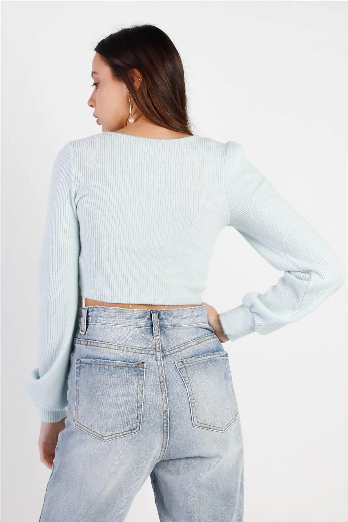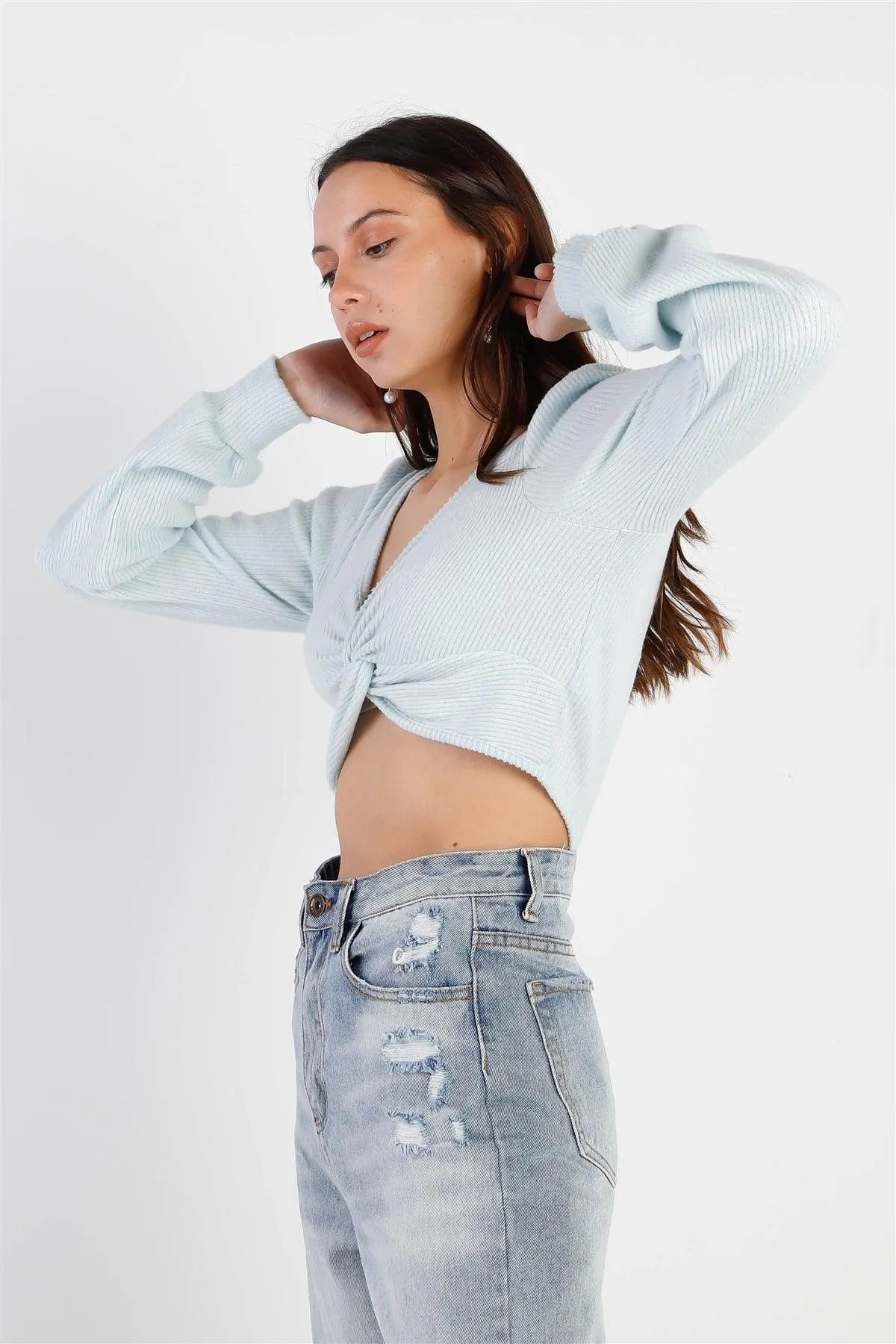 🖤 Item features: Sky blue, solid color, ribbed fluffy material, front twisted detail, v-neckline, long cuffed sleeves, cropped length, unlined, stretchy, non-stretchy, casual, cute, stylish, trendy