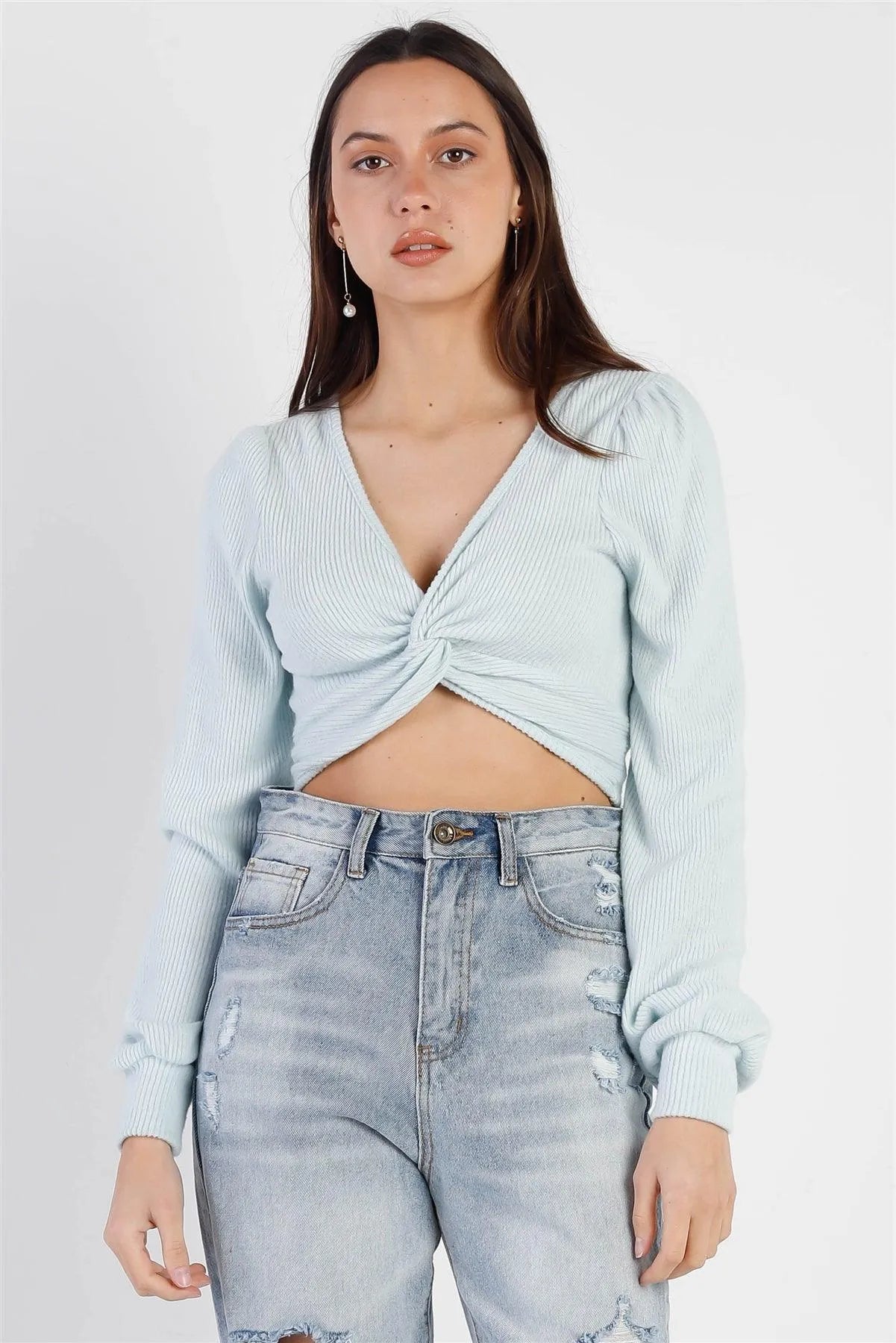 Sky Blue Ribbed Fluffy Front Twisted Detail Crop Top /3-2-1