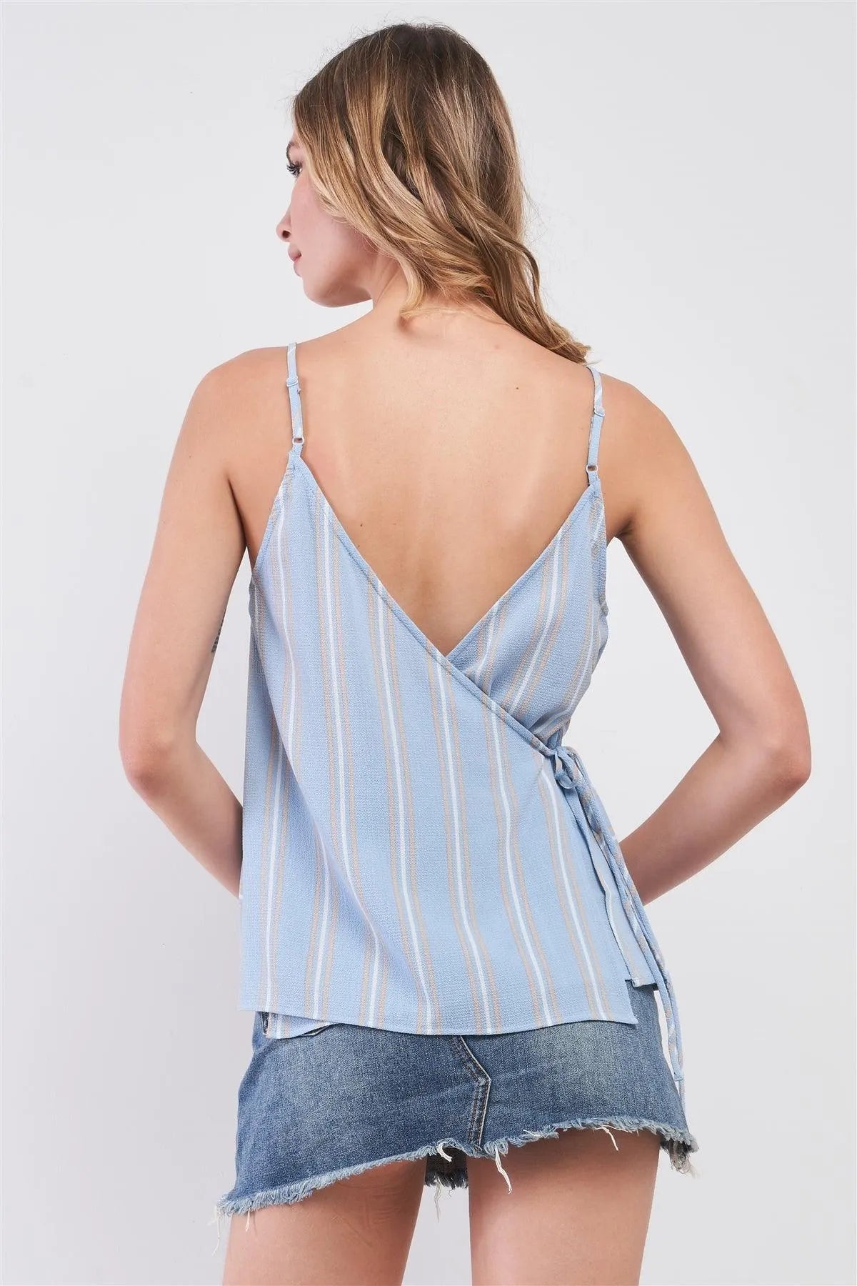 Sky Blue & White Striped V-Neck Sleeveless Back Wrap Self-Tie String Top /1-2-2-1