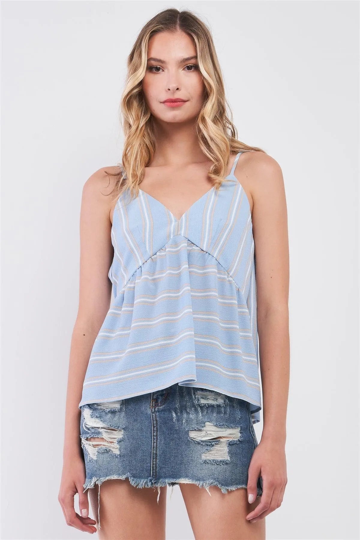 Sky Blue & White Striped V-Neck Sleeveless Back Wrap Self-Tie String Top /1-3-2