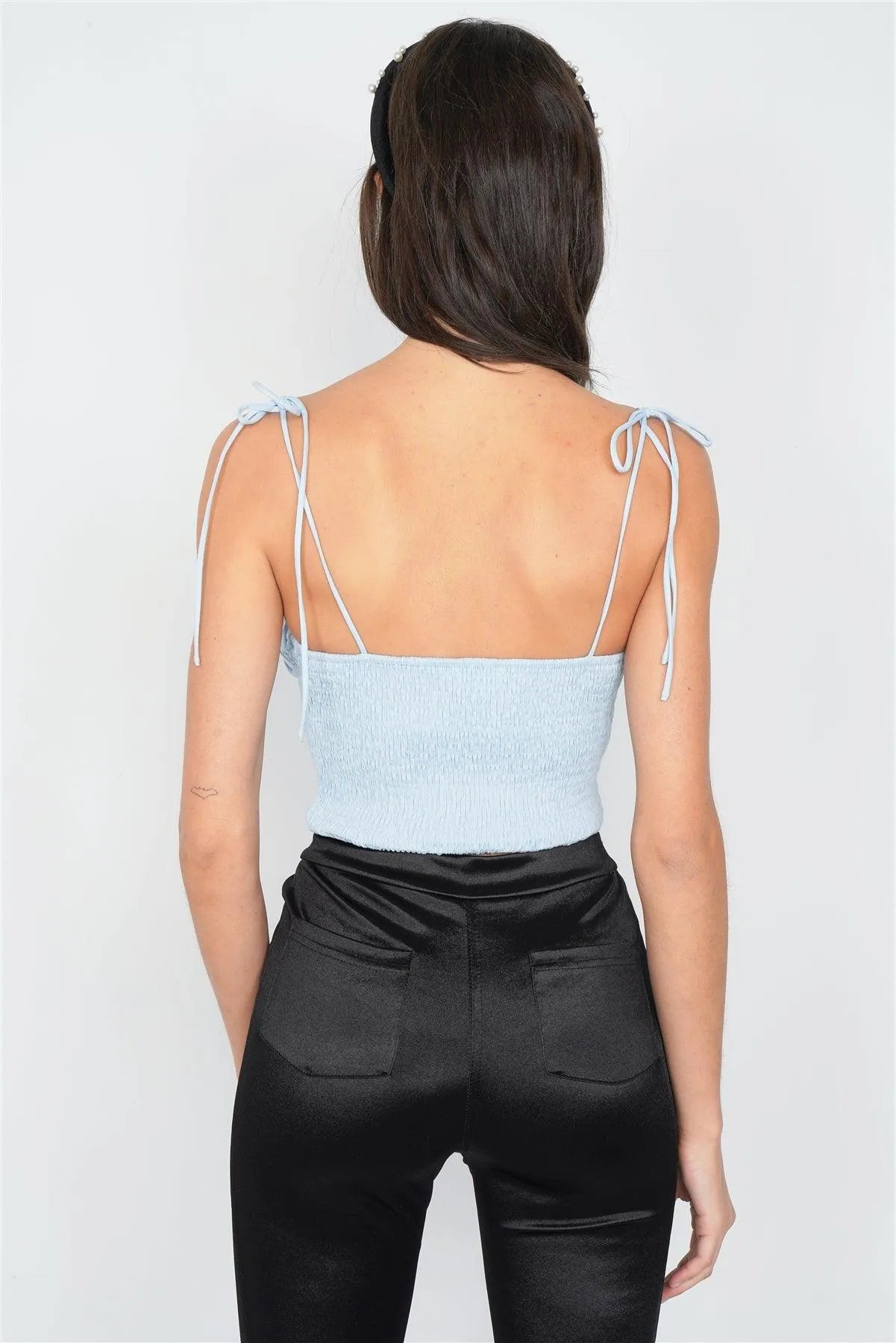 Top Features: elasticized crop top, ruched detail, bustier bust, self-tie neck line on front, adjustable tie straps, stretchy, solid, unlined, casual, boho, summer styleItem Measurements: Length: 10", Bust: 14"Model is 5'9 wearing a size Small ( Waist: 23.5", Bust: 32B, Hips: 36")Item comes pre-packed with hang tagsTrue to SizeAlso available in Black, Off-White, Pink and Yellow