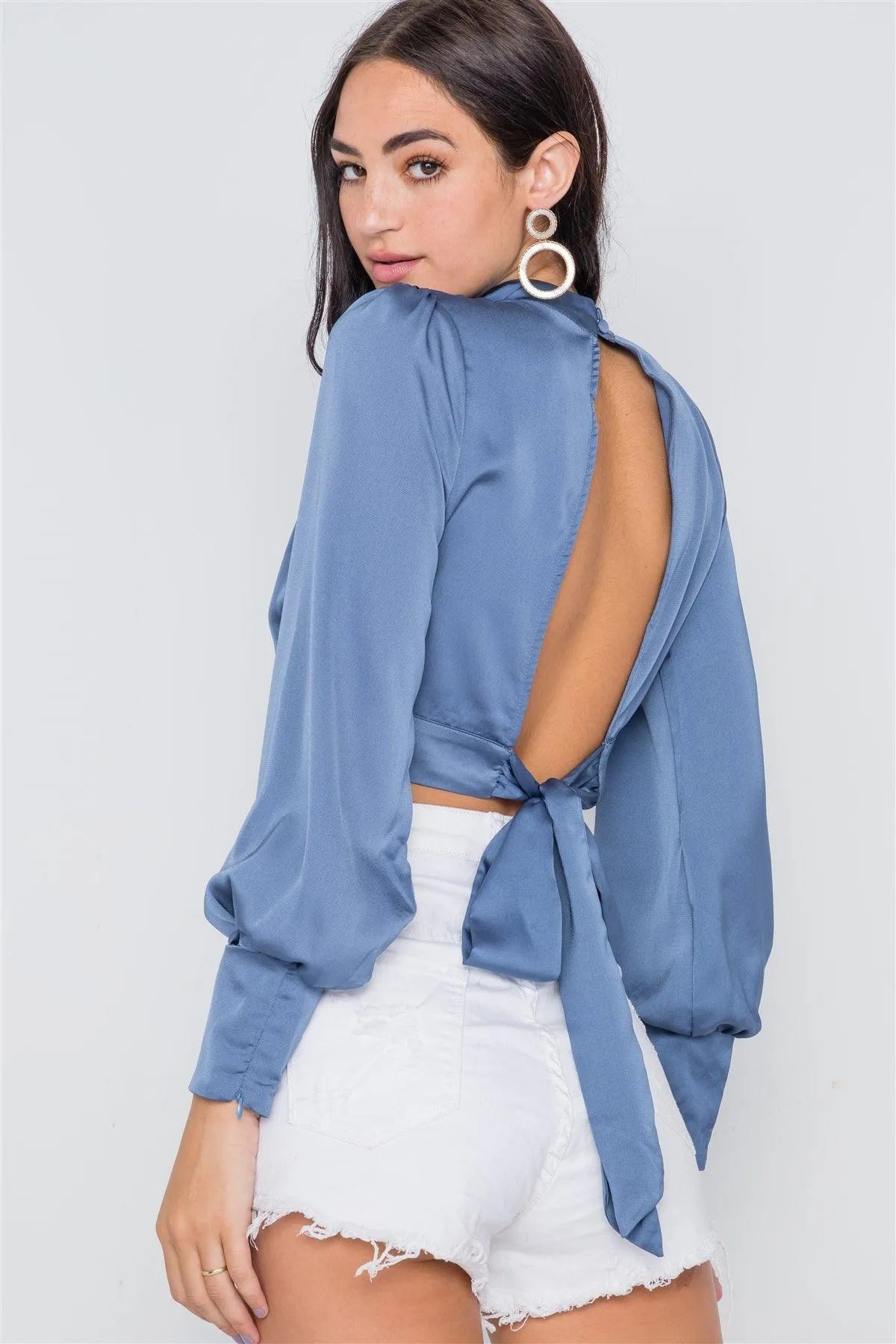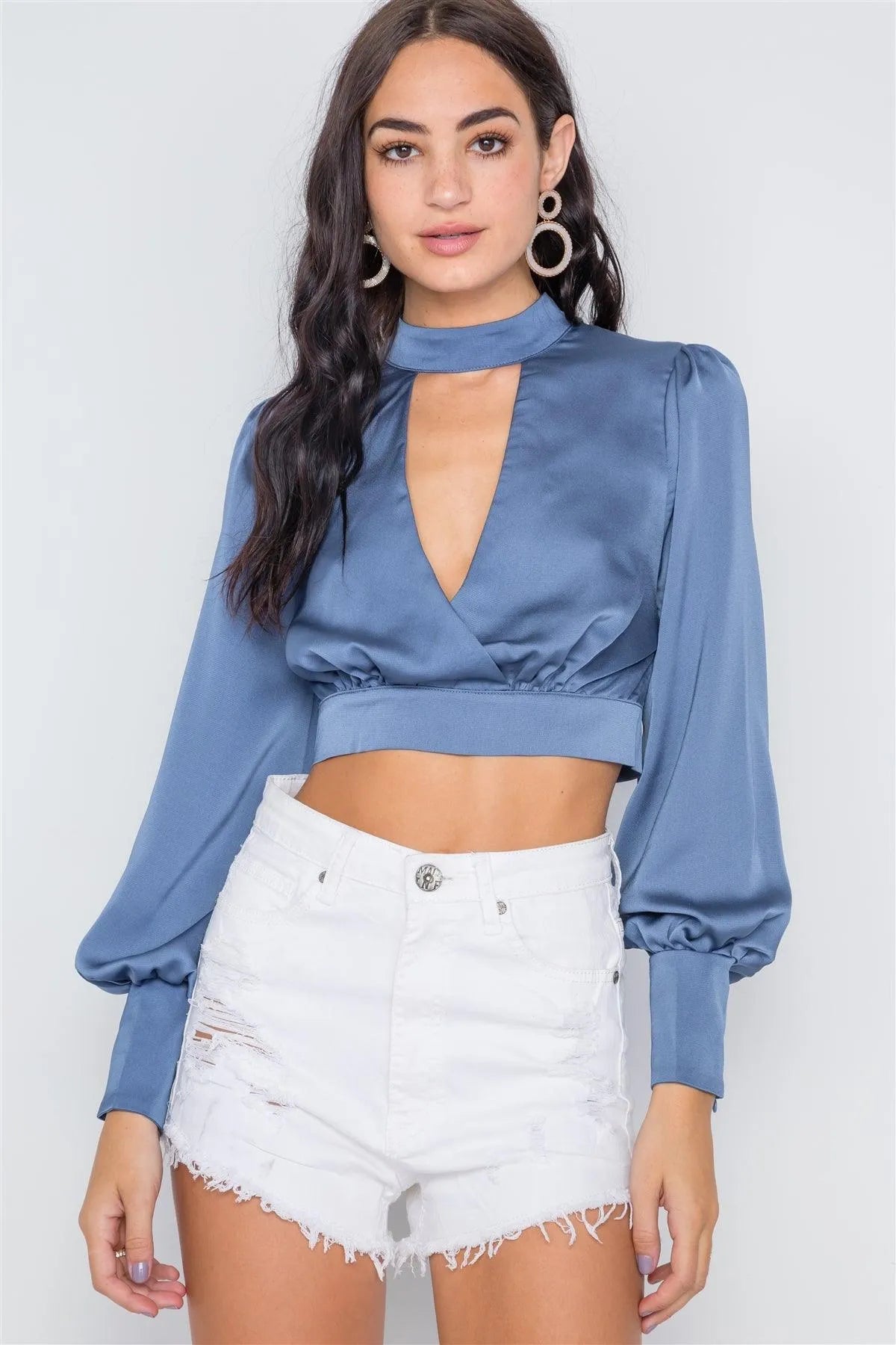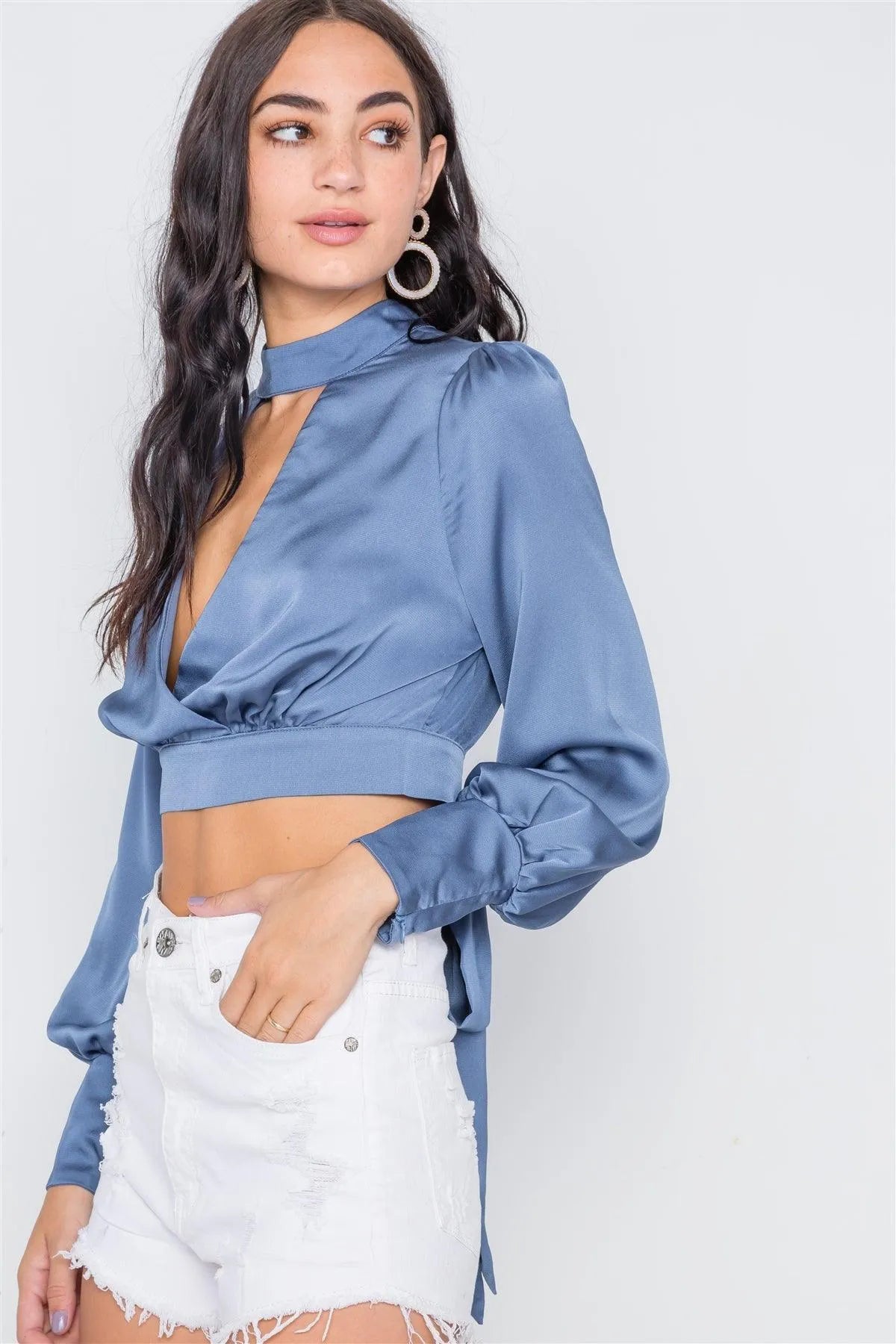 Slate Blue Satin Long Sleeve Crop Top /3-2-1