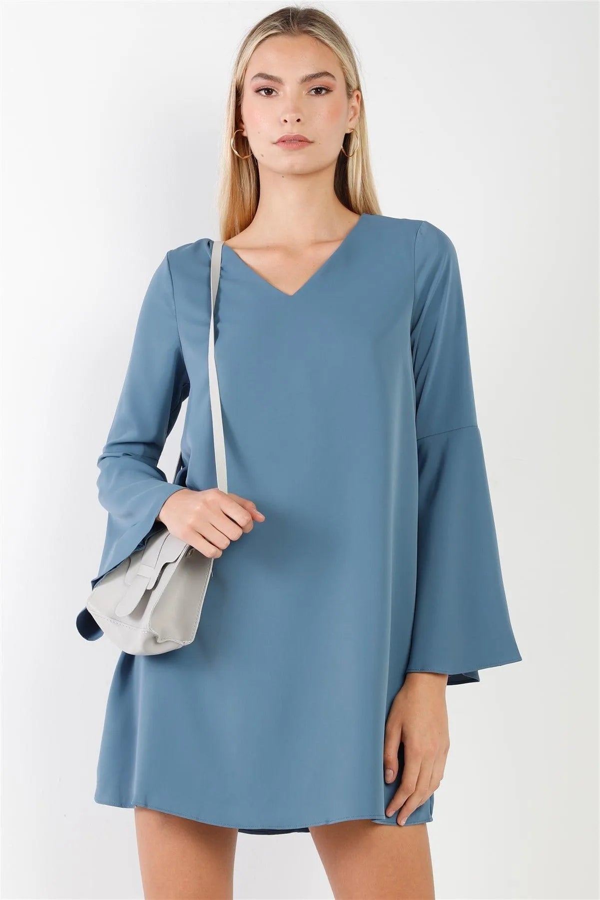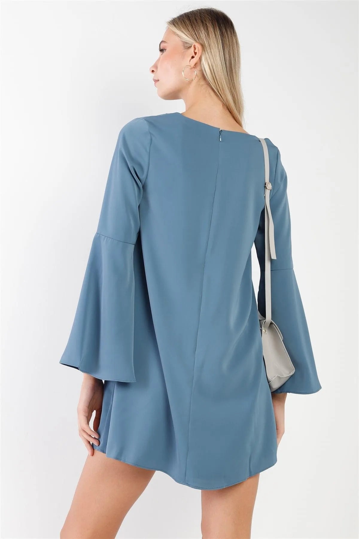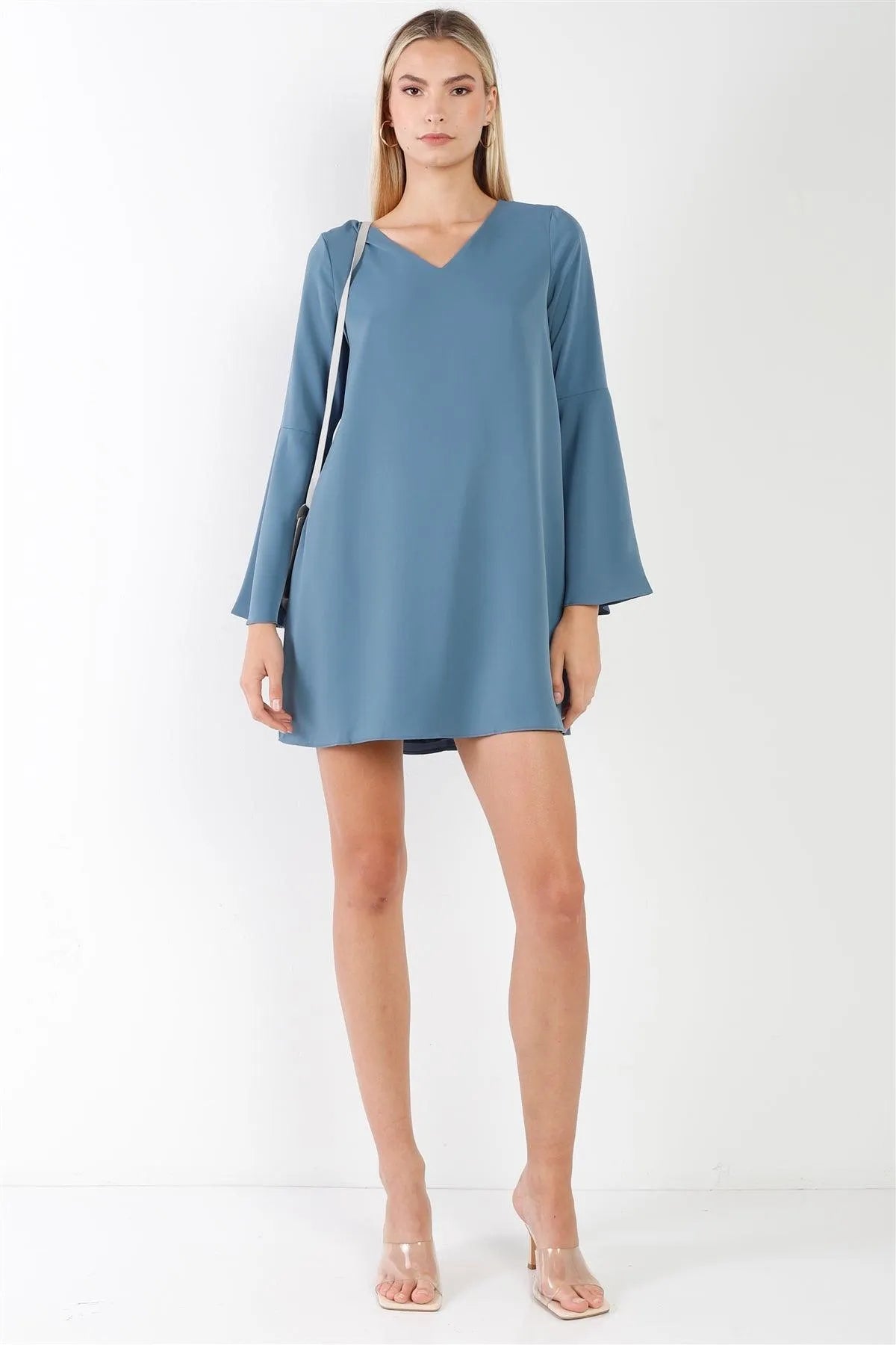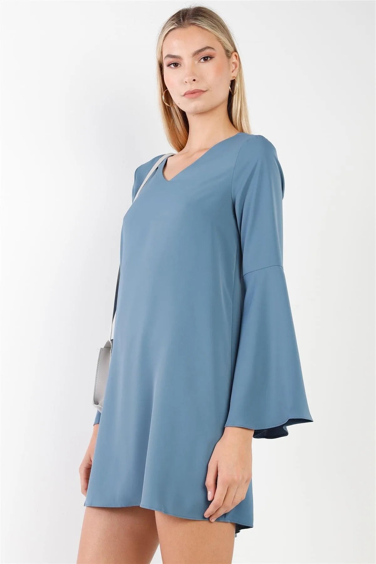 Slate Blue V-Neck Trumpet Sleeve Detail Flowing Relaxed Mini Dress /1-2-1