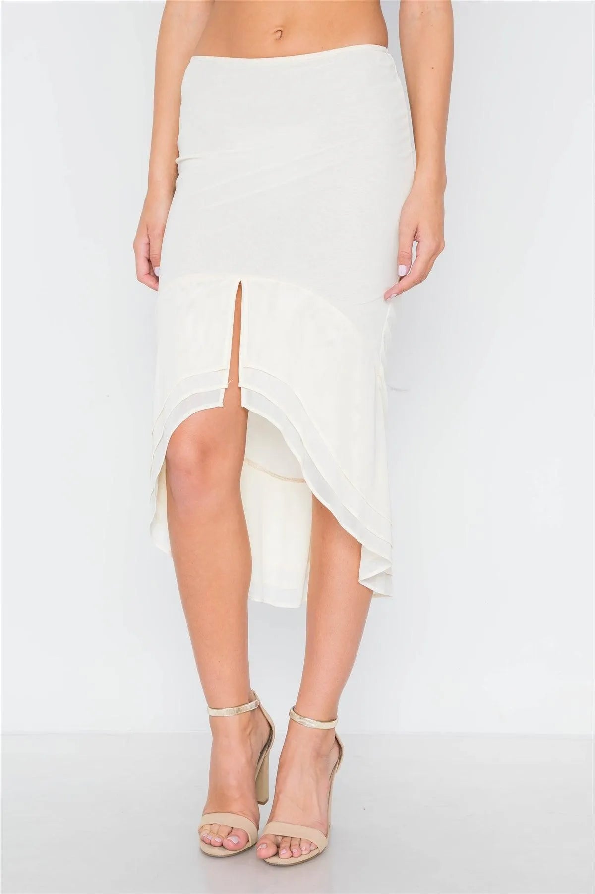 Skirt features: high waisted, shirred hem, lined, front slitModel is 5'8" and wearing a Small (Waist 24", Bust 32A", Hips 34")Item measurements: Length: 32", Waist: 26"True to size