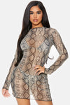 Reptile Snake Print Cover Me Long Sleeve Mesh Sheer Pool Swimwear Coverup Mini Dress