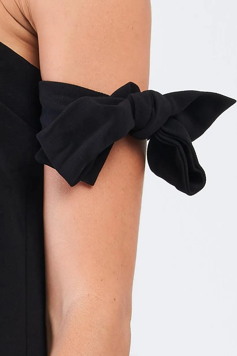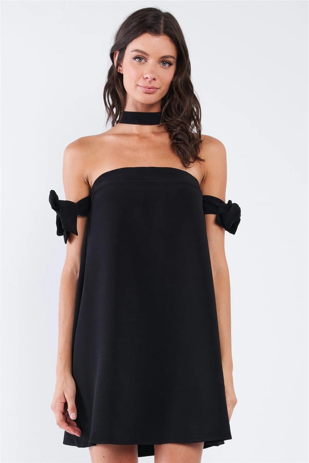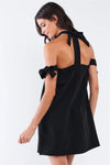 Solid Black Bow Tie T-Silhouette Back Halter Tie Ribbon Tie Sleeve Relaxed Fit Tunic Tube Mini Dress With Elastic Chest Hem /3-3