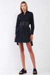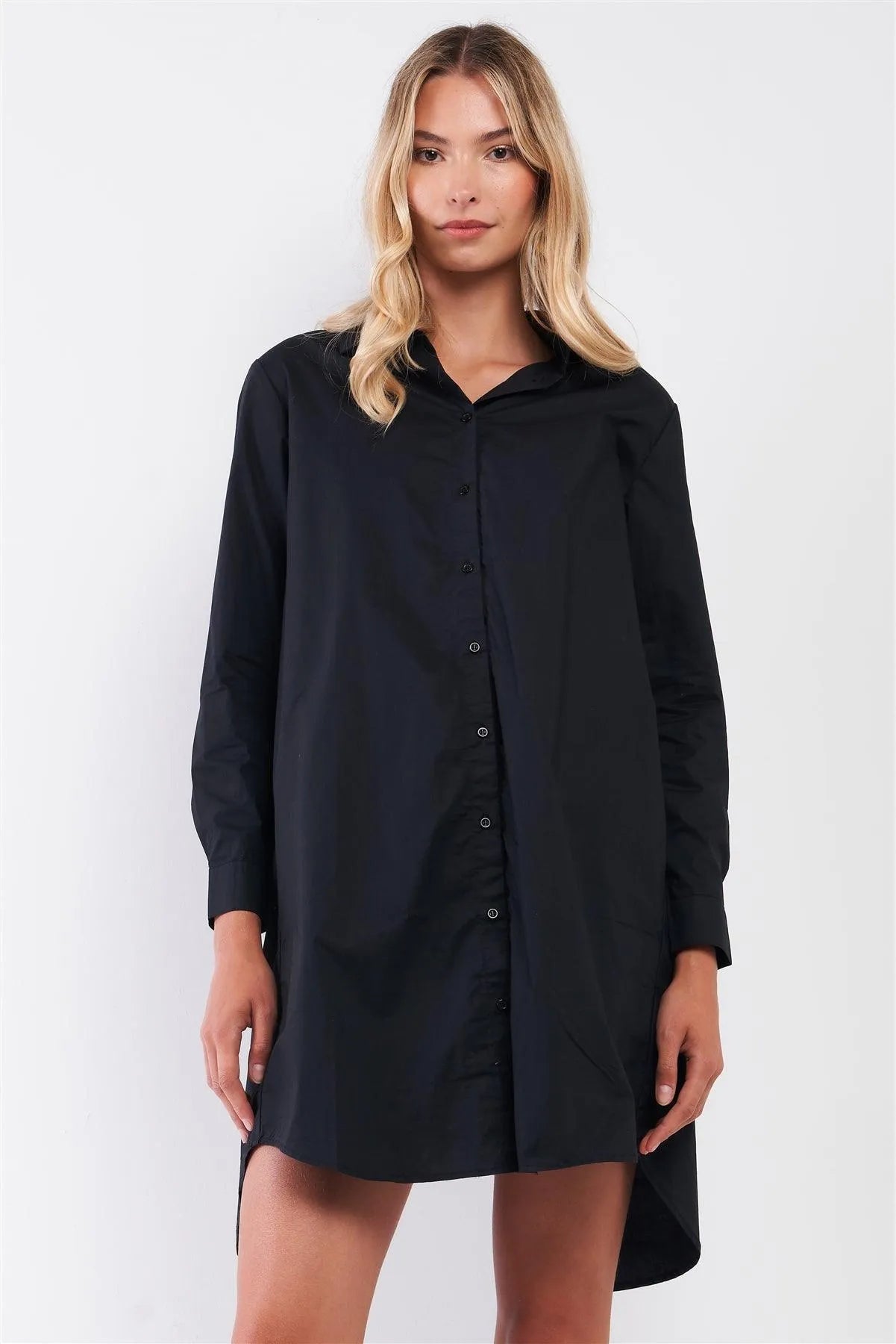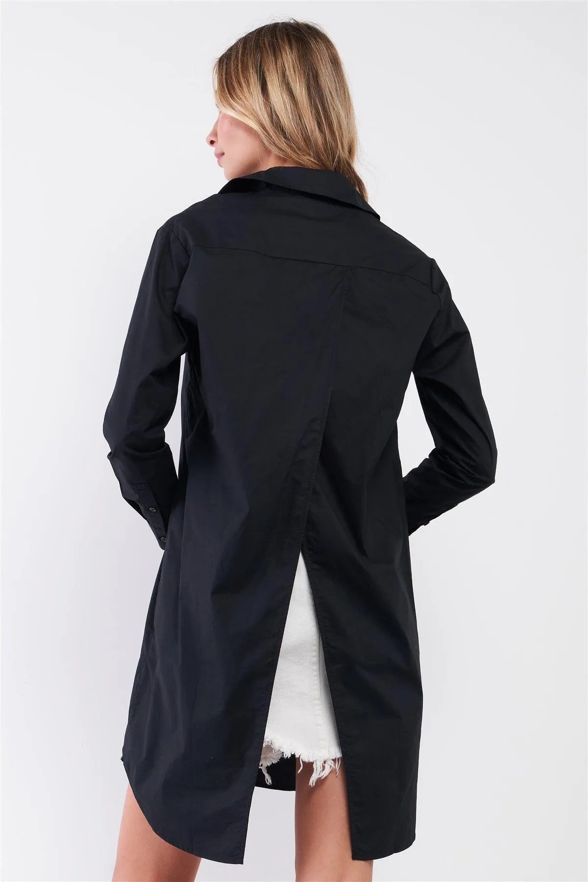 Solid Black Cotton Long Sleeve Front Button Down Back Slit Dress-Shirt Top /1-2-2-1