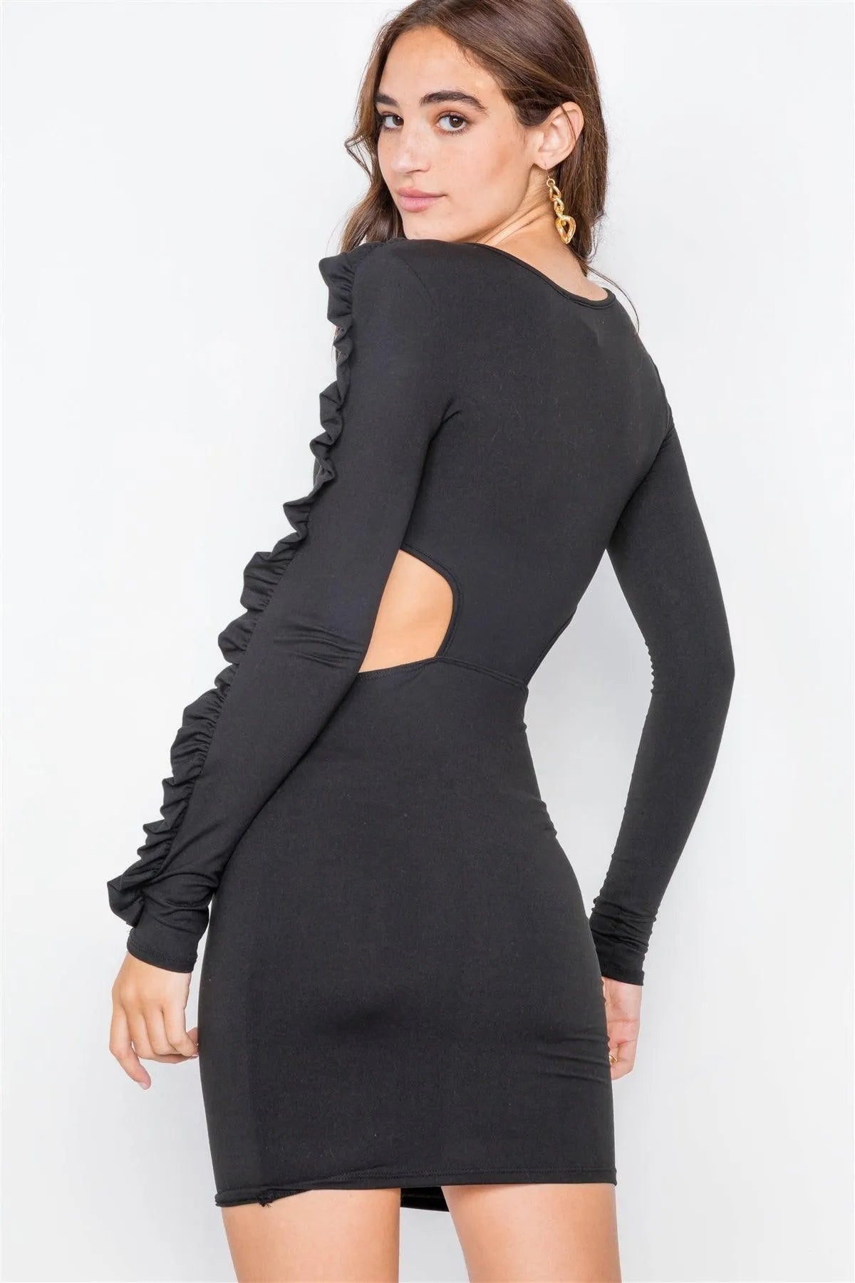 Solid Black Cut-Out Flounce Sleeve Trim Mini Dress /2-2-2