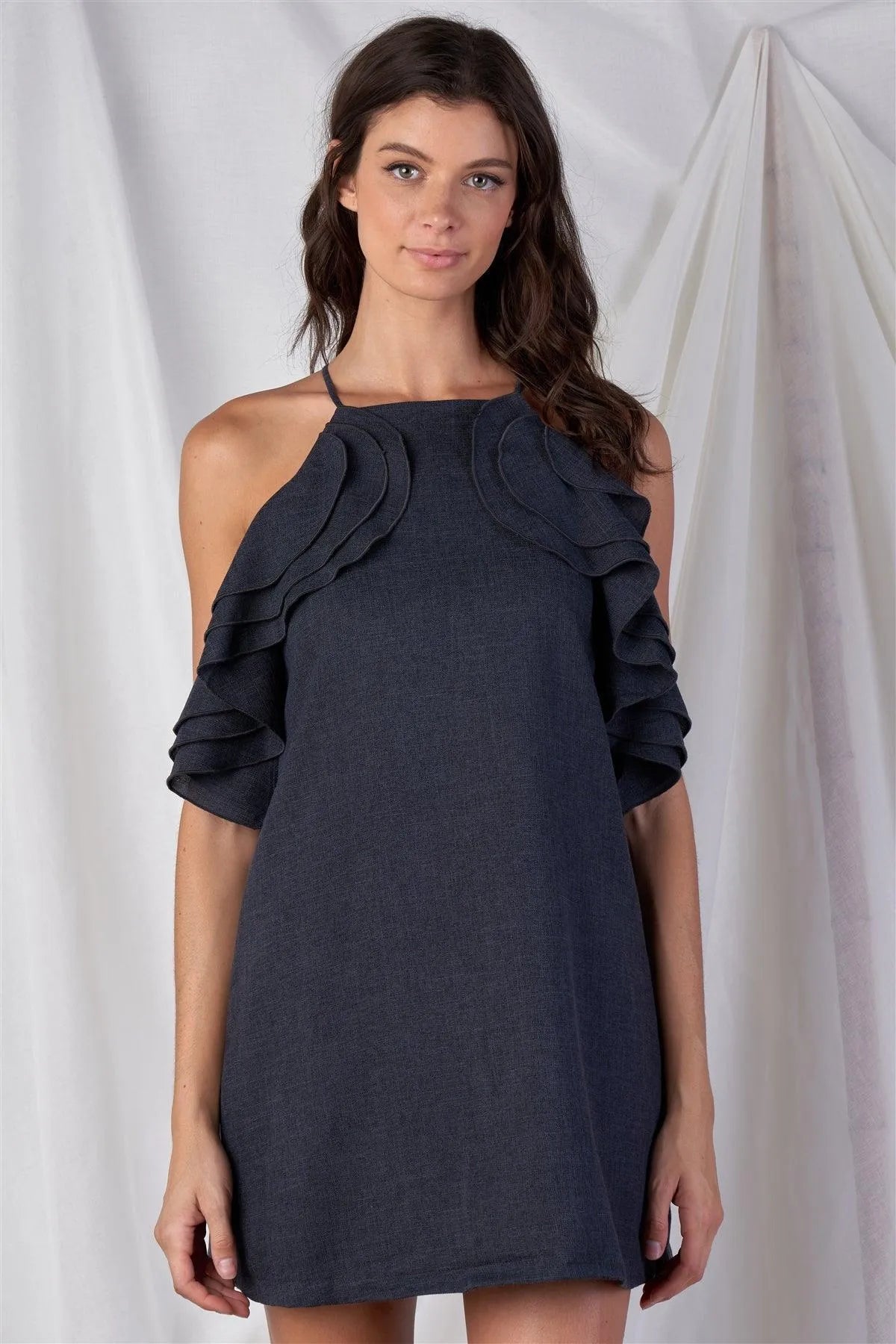 Solid Dark Grey Loose Fit Sleeveless Off-The-Shoulder Massive Triple Ruffle Hem Lined Mini Dress /1-2-1
