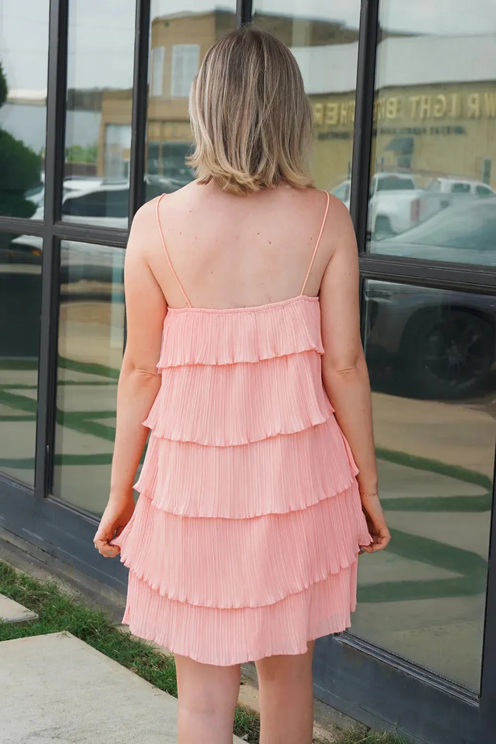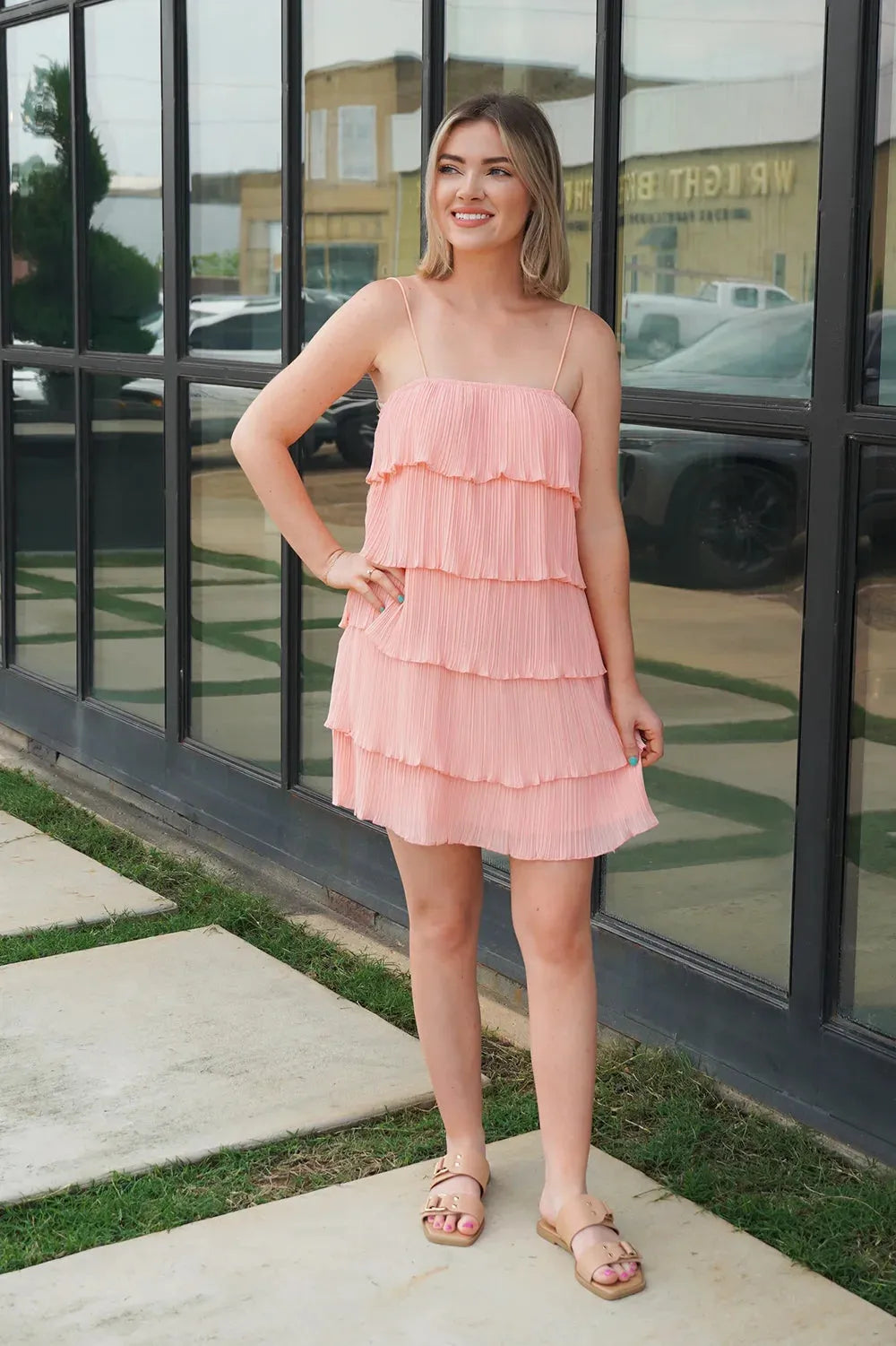 Elevate your boutique's spring and summer collection with our dreamy tiered mini dress! This lightweight pleated dress features delicate layers that create gorgeous movement with every step. Available in soft coral pink and elegant cream, this versatile piece is designed to make your customers feel effortlessly feminine while keeping them cool and comfortable.