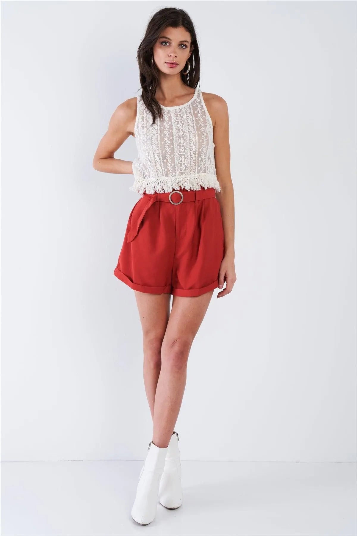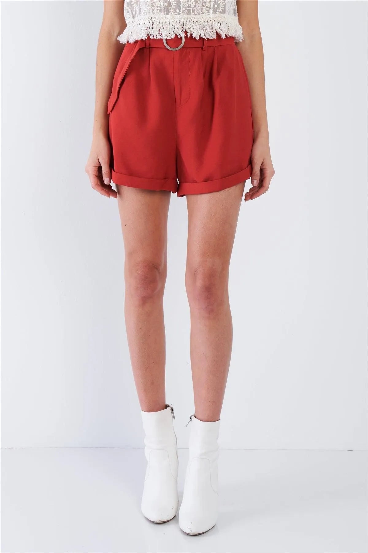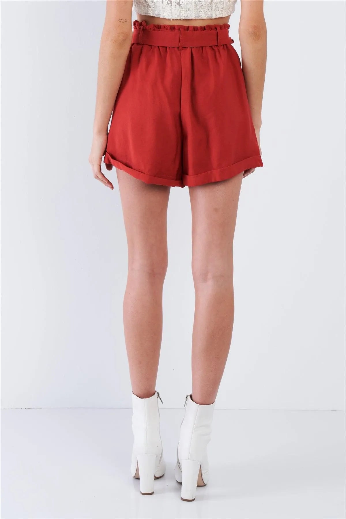 Spice Red Frill Trim High Waist Belted Boho Chic Shorts /3-2-1