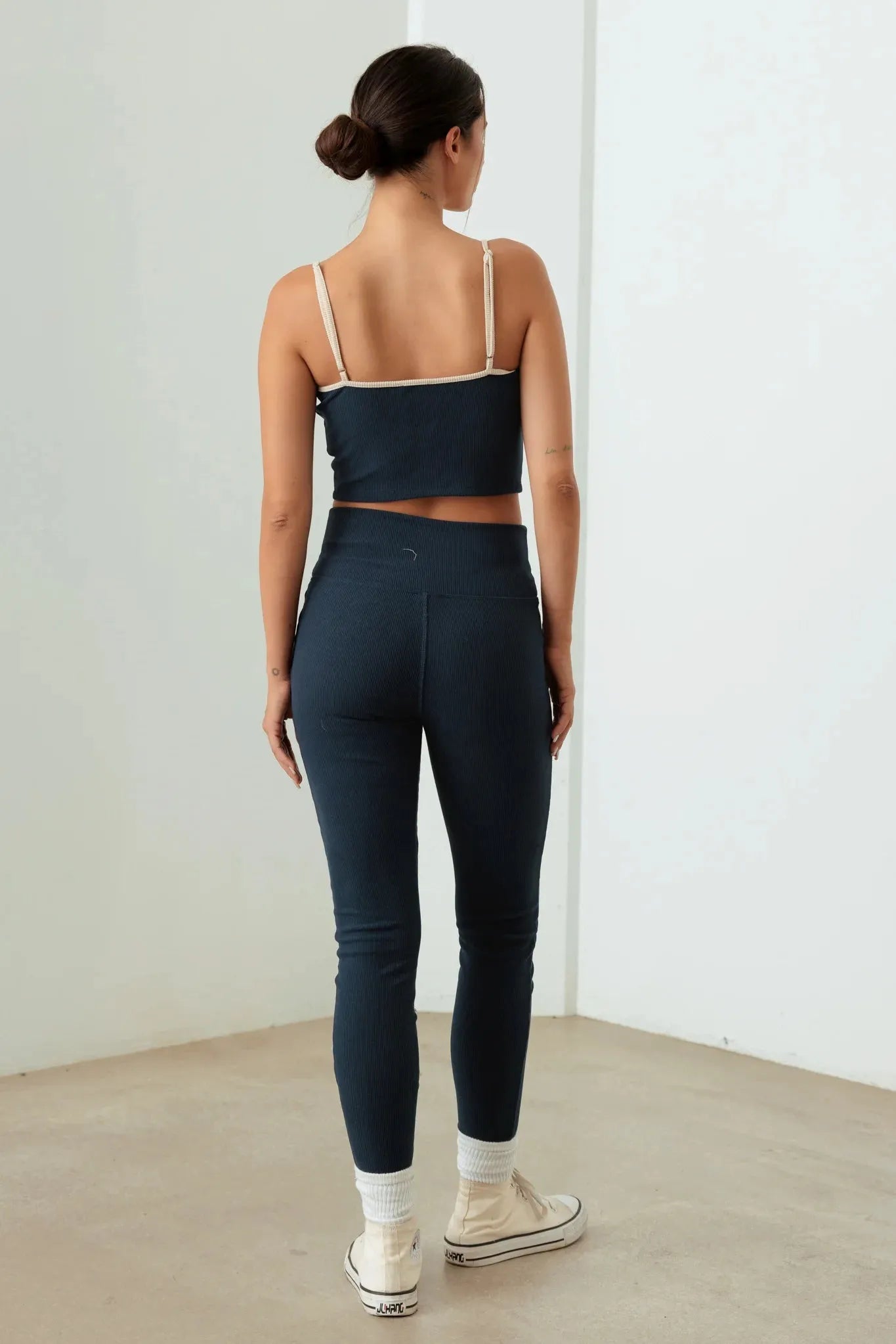 🖤 Features: Ribbed fabric, contrast trim detailing, crop top with unique bust curve, high-waisted leggings, stretchy material, moisture-wicking, available in black and navy, versatile styling options