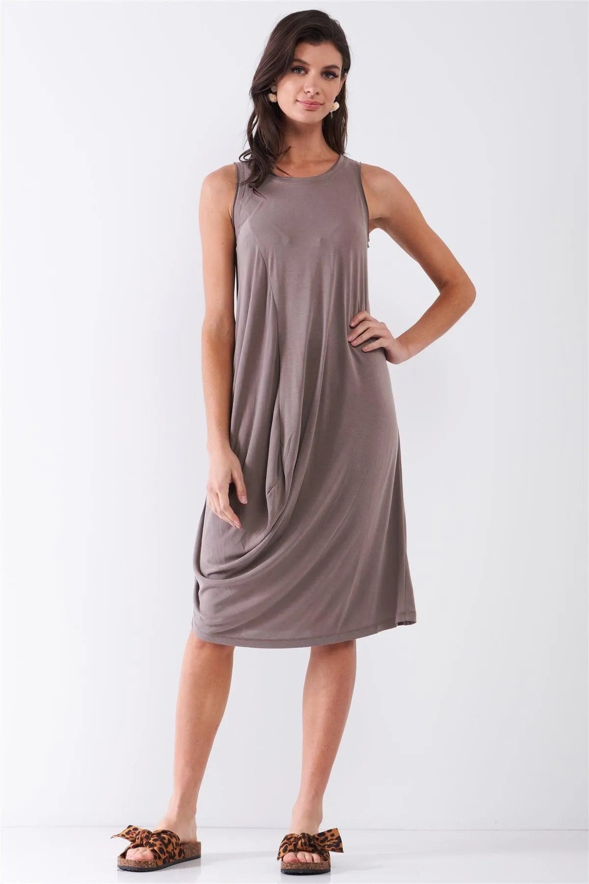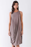 Stone Brown Sleeveless Round Neck Gathered Front Detail Relaxed Fit Midi Dress /1-2-2-1