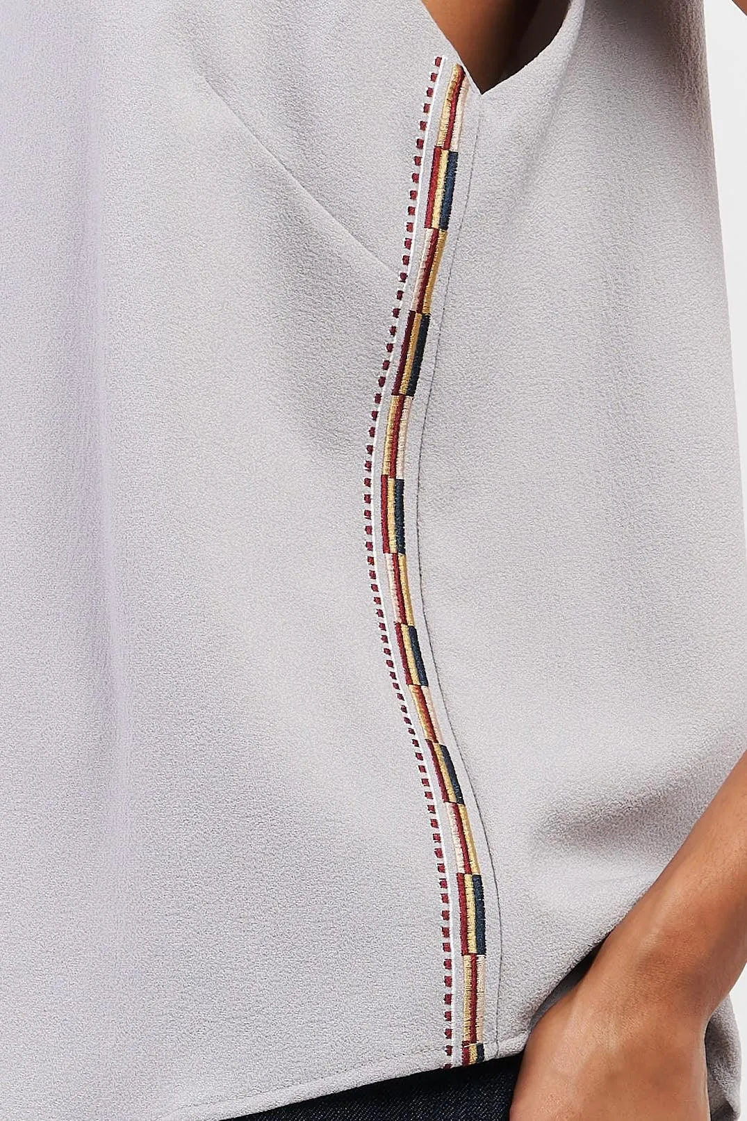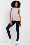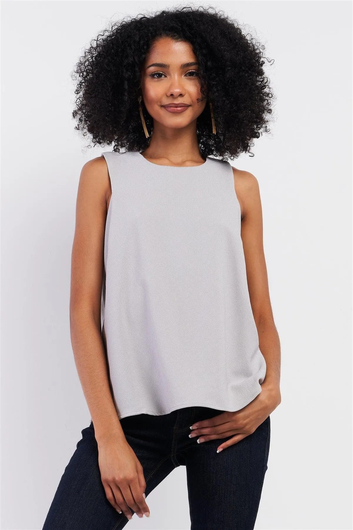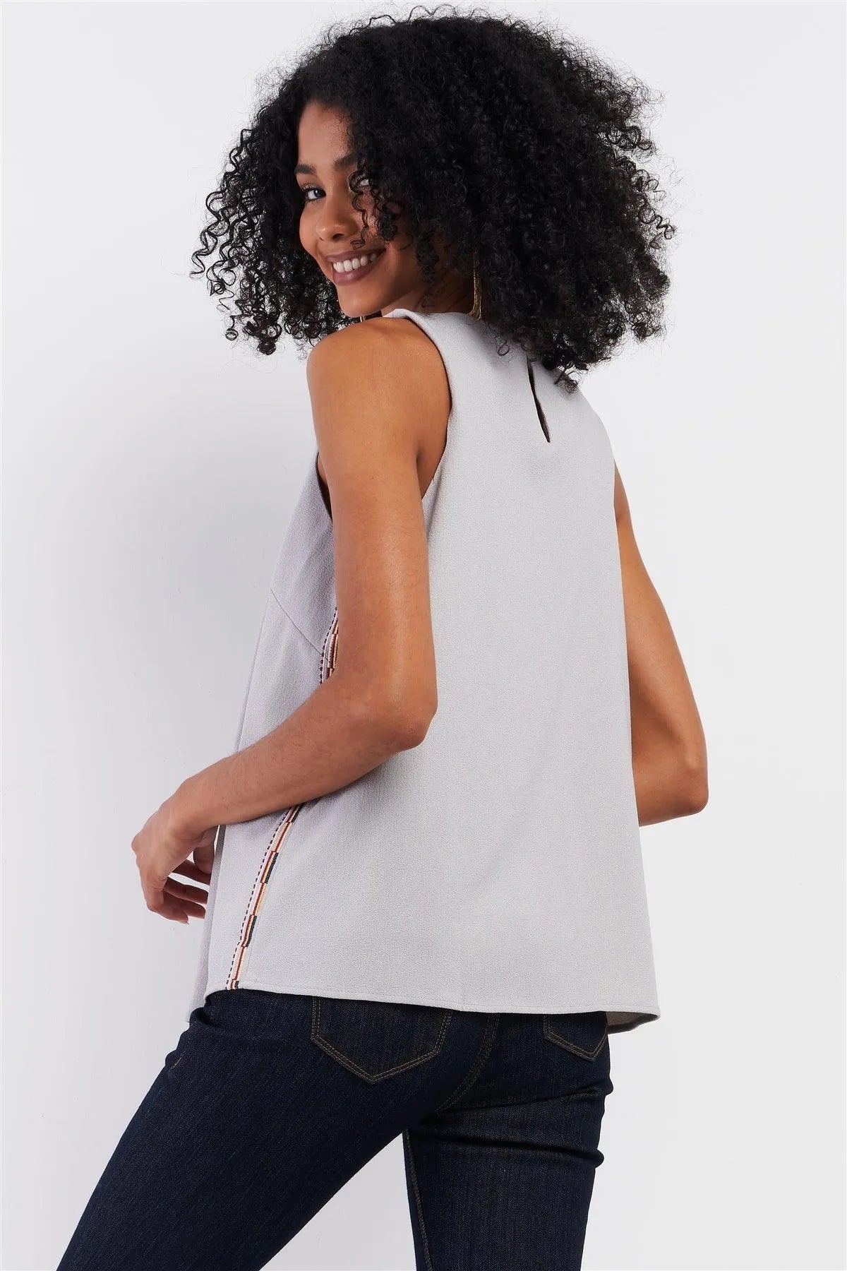 Stone Grey Sleeveless Round Neck Side Embroidery Trim Detail Babydoll Top /2-1-2