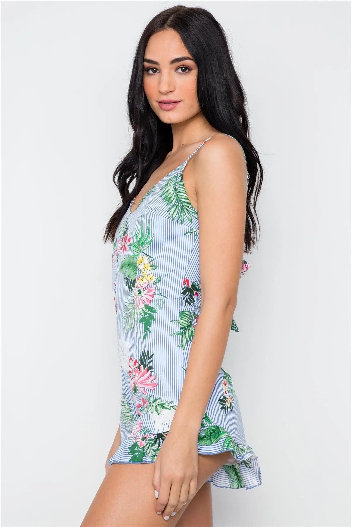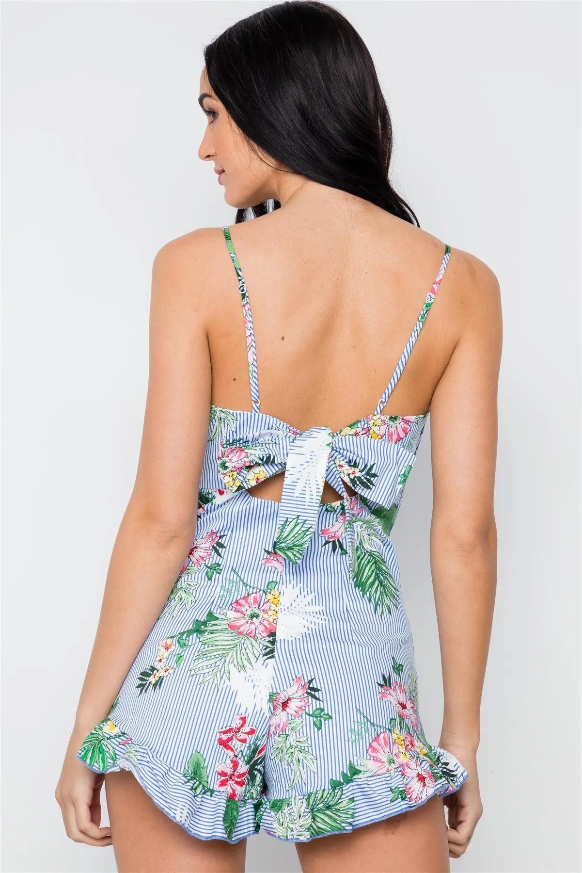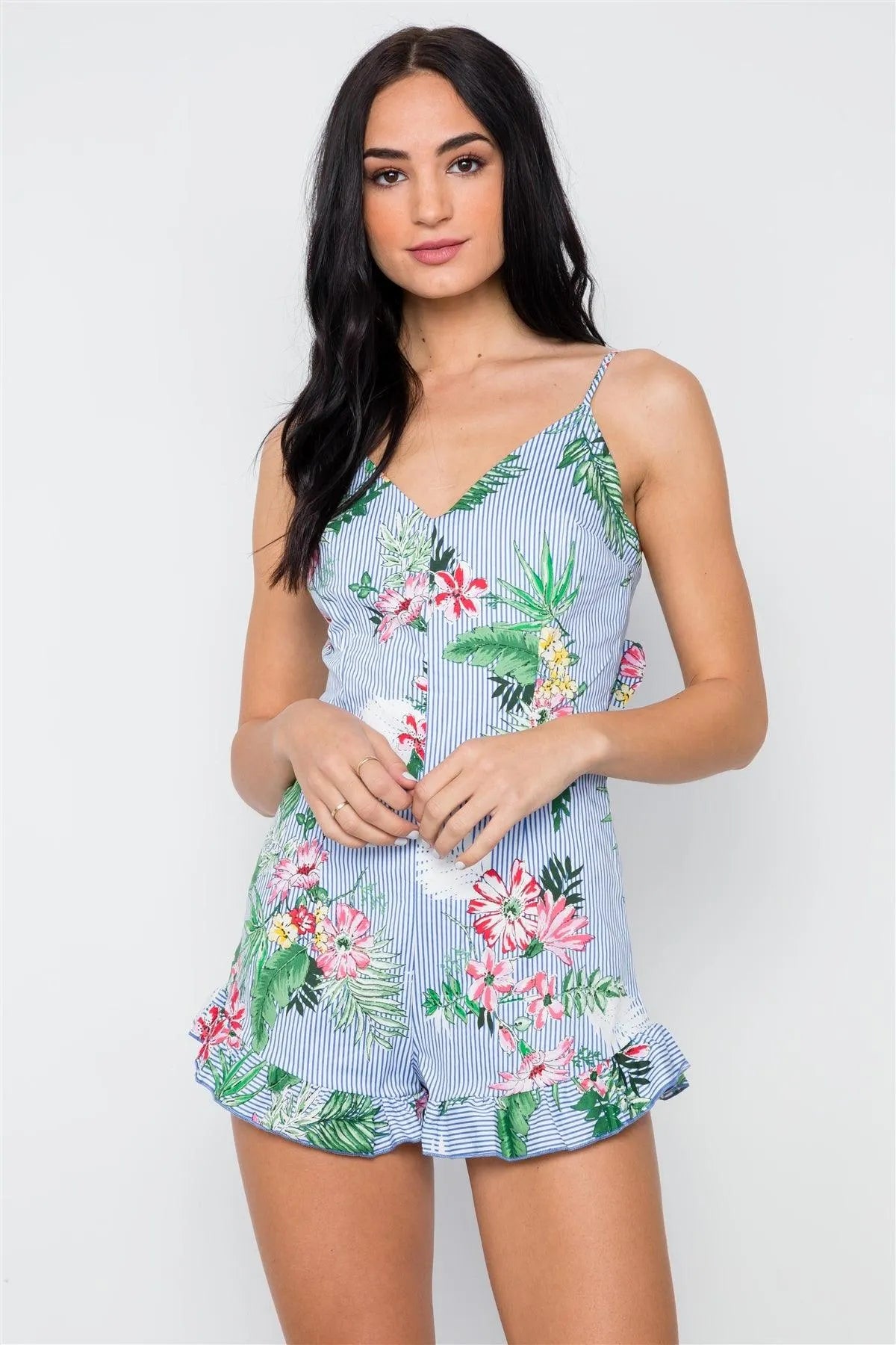 Stripe Blue Tropical Floral Print Ruffle Romper /3-2-1