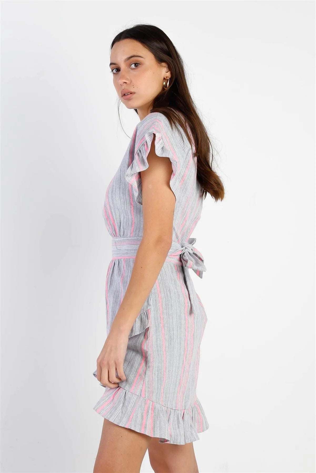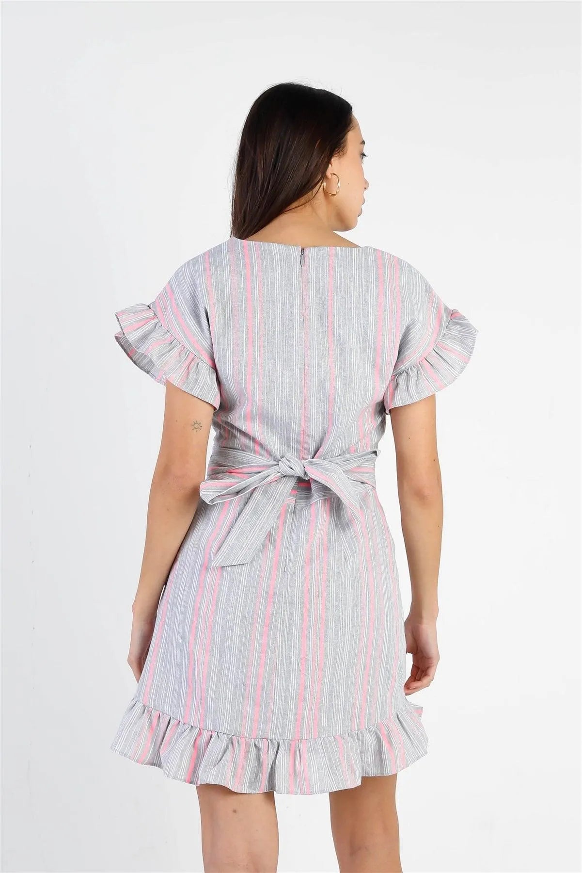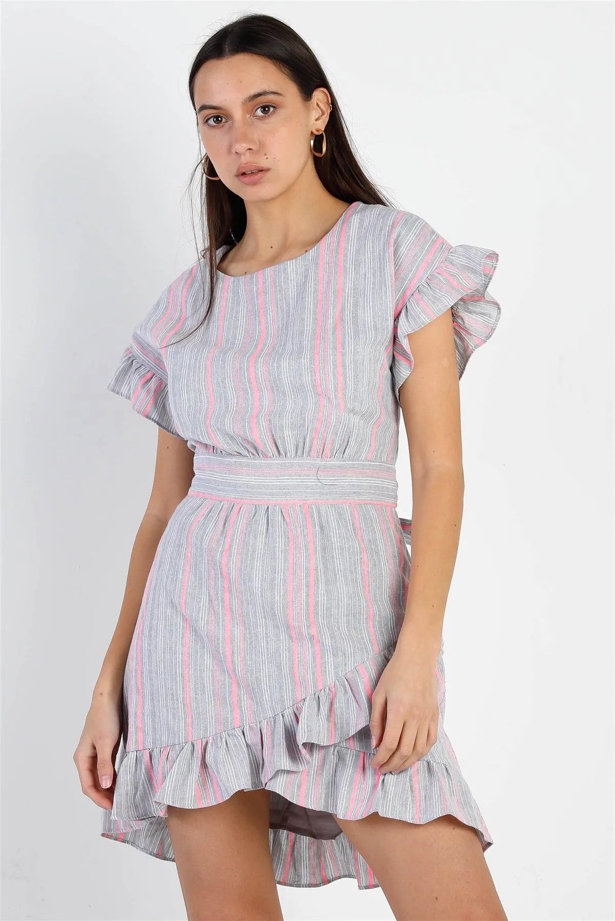 🖤 Item Features: grey, white, pink striped print, short ruffle sleeves, self tie belt, mini length, asymmetrical hem, flare hem, lined, back hook & eye closure, hidden zipper closure, non-stretchy, not see through, casual, girlish, lightweight, perfect summer look, stylish, trendy.