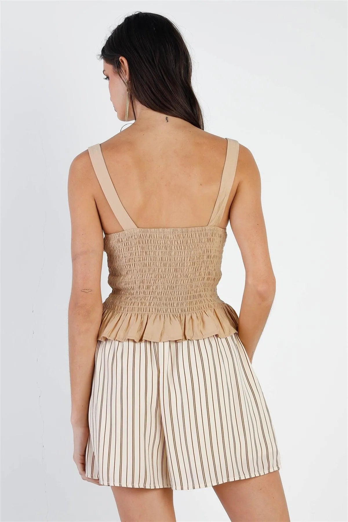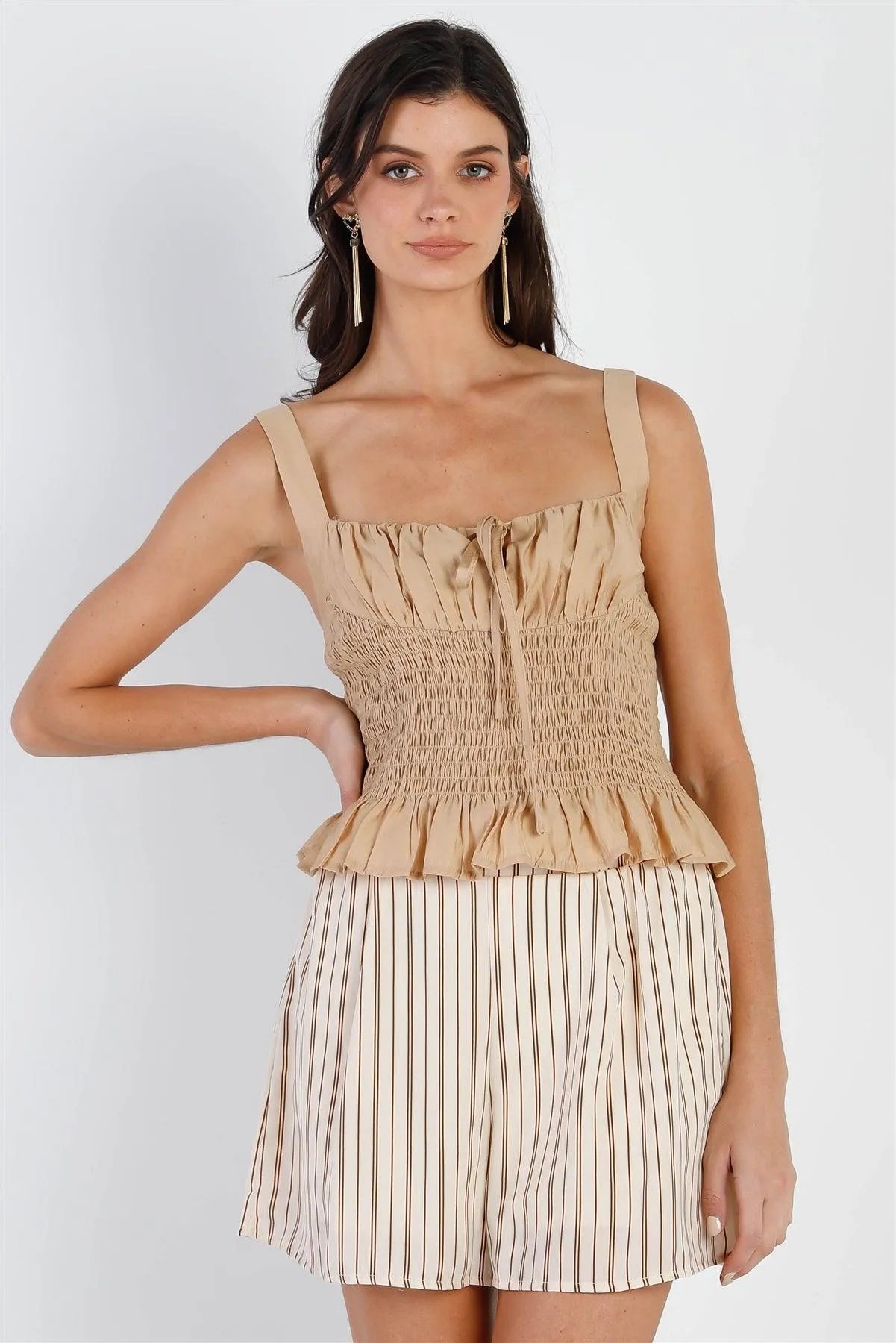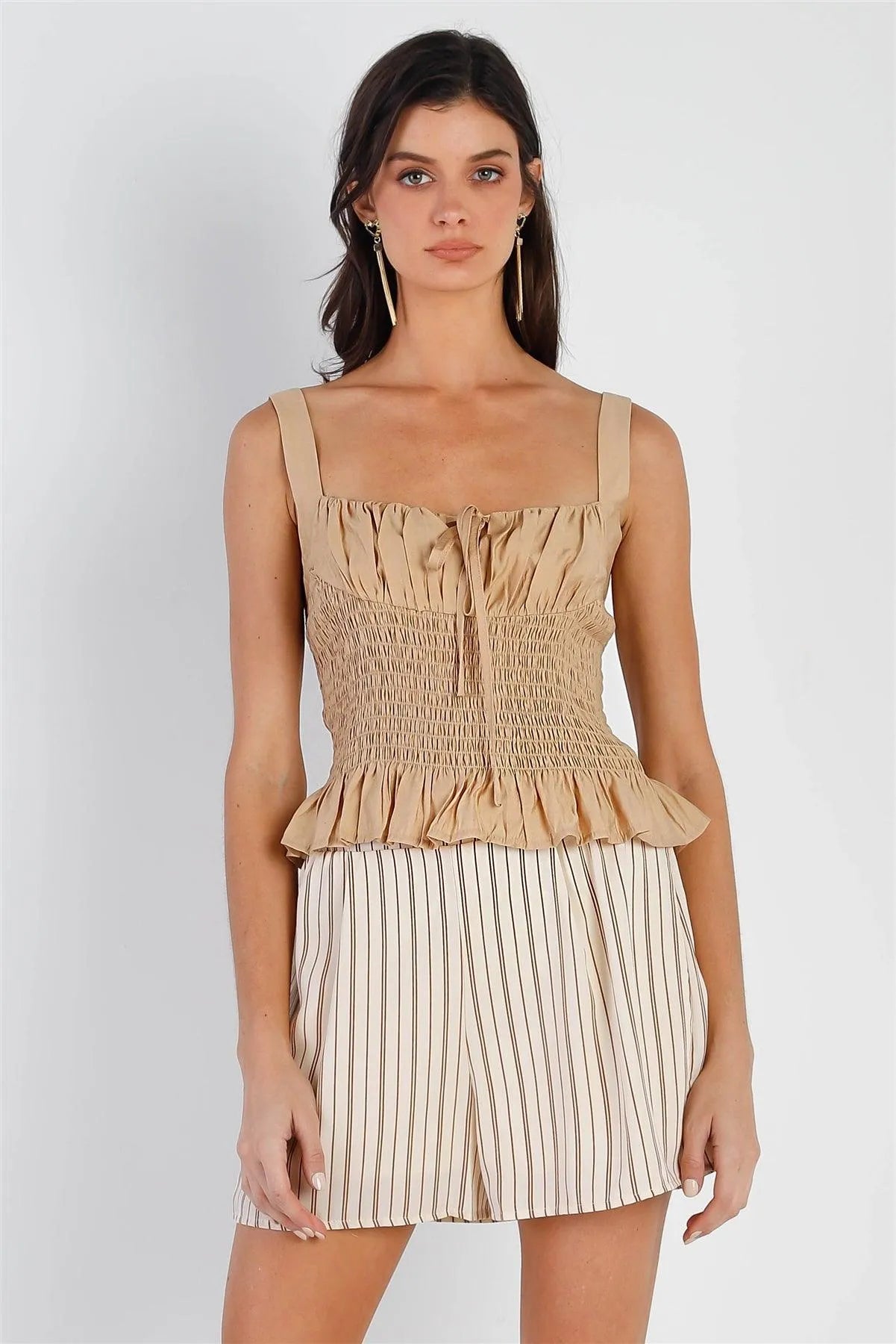 Tan Smocked Bustier Self-Tie Detail Sleeveless Top /3-2-1