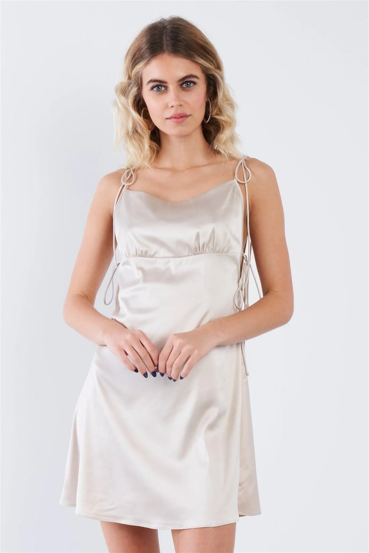 Dress Features: self tie side cut out, hidden side zipper closure, mini length, silk, summer, dress, square neck, self tie cami strap, unlined, chic, relaxed fit, retro, solid, some stretch. Model is 5'5" and wearing a Small (Waist: 23", Bust: 32A", Hips: 24")Item Measurements: Length: 31.5" , Bust: 28"Item comes pre-packed with hang tagsTrue to size
