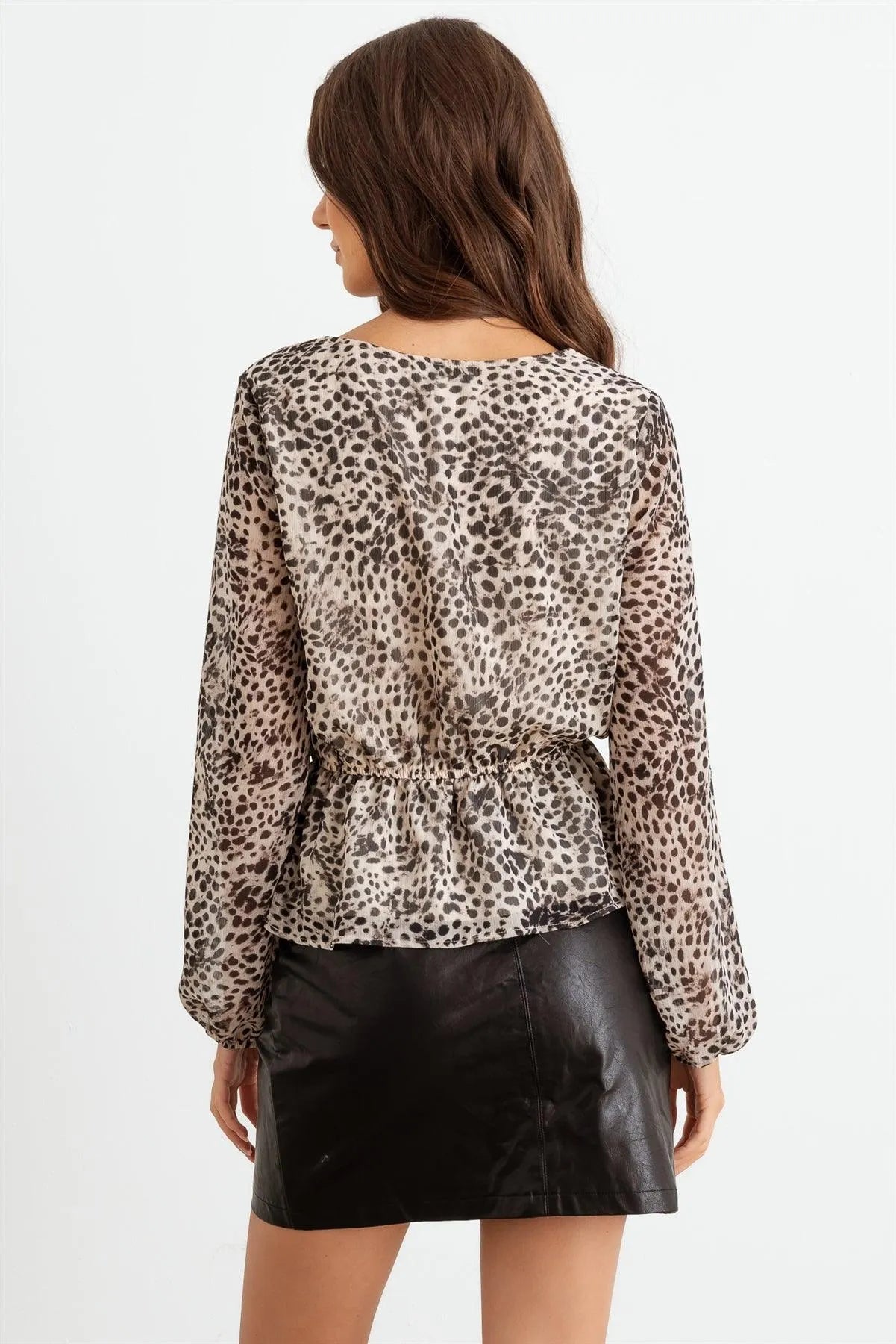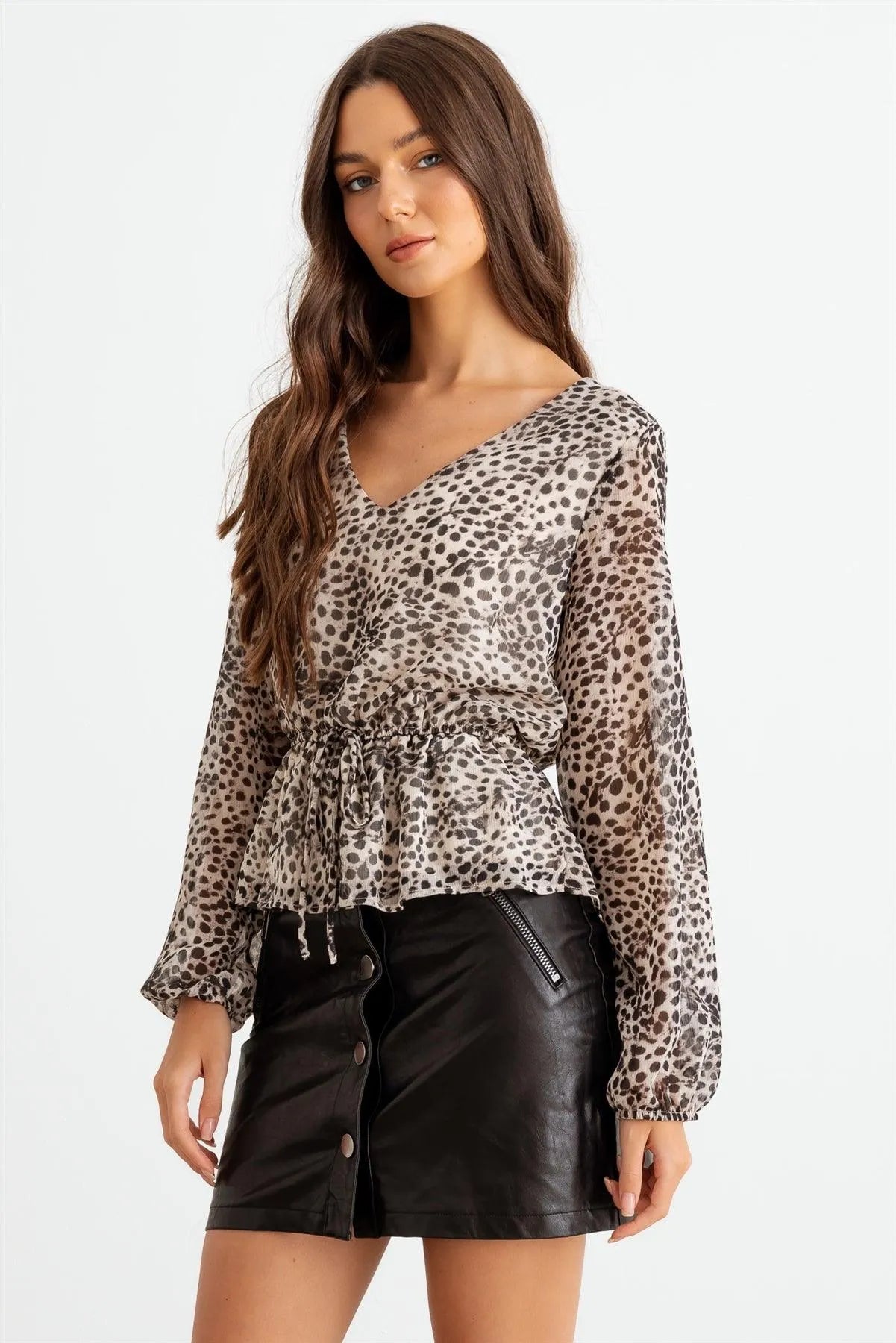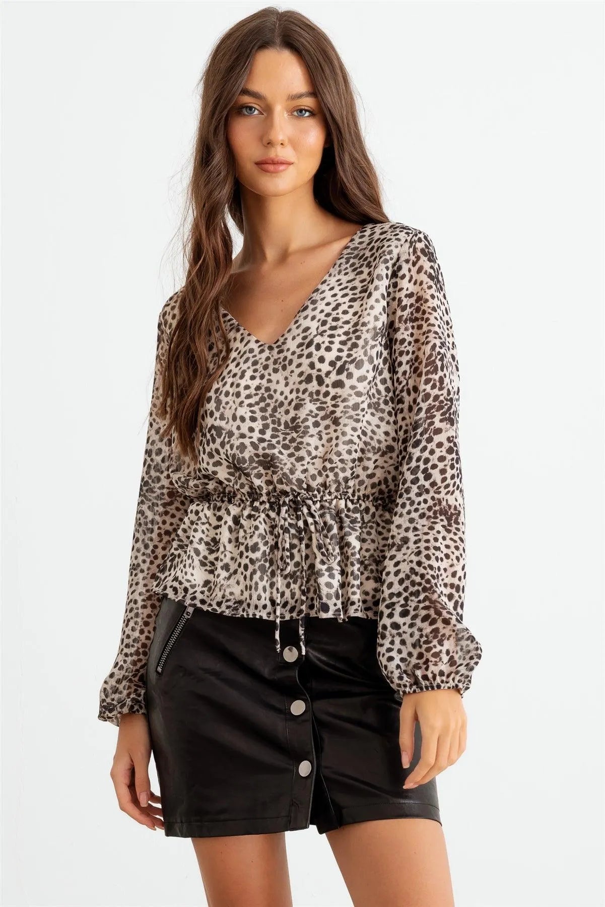 🖤 Item Features: Taupe & black, leopard print, v-neckline, elasticized waistband with adjustable drawstring, long sleeves, flare hem, semi-stretchy, semi see through, lined, cute, sexy, cool, stylish
