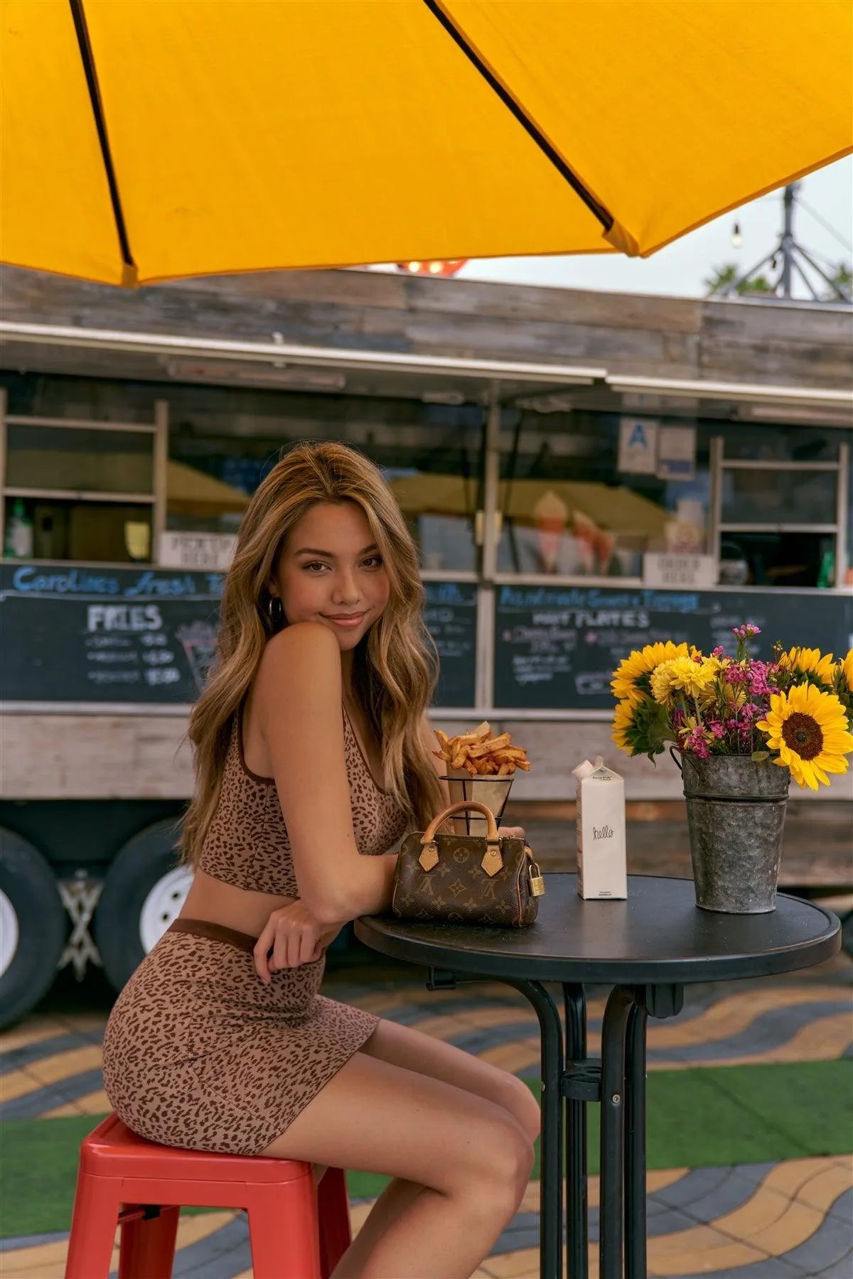Top features: crop length, tank top, leopard print, contrast trim, sporty, scoop neck , boho, chic, unlined, stretchy.Top Measurements: Length: 13.5", Bust: 15"Model is 5'9 wearing a size Small ( Waist: 23.5", Bust: 32B, Hips: 36")Bottom features: bodycon fit, mini length, unlined, elastic waistband, very stretchy.Bottom Measurements: Length: 16", Waist: 25"True to sizeAlso available in Mustard Black