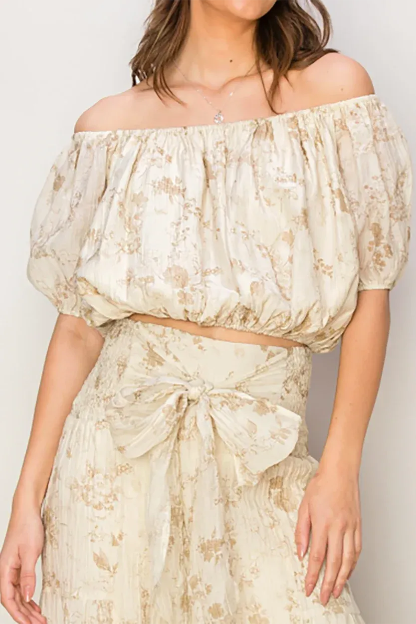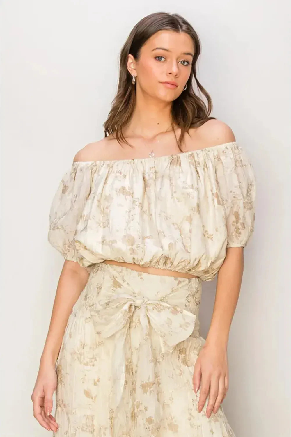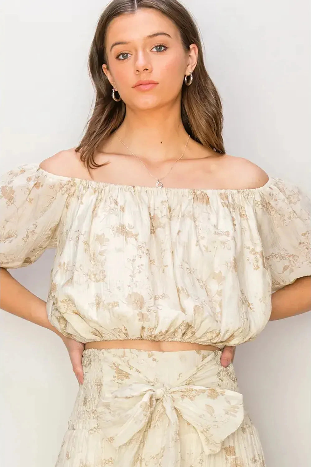 Taupe Floral Off-Shoulder Elastic Hem Puff Sleeve Crop Top