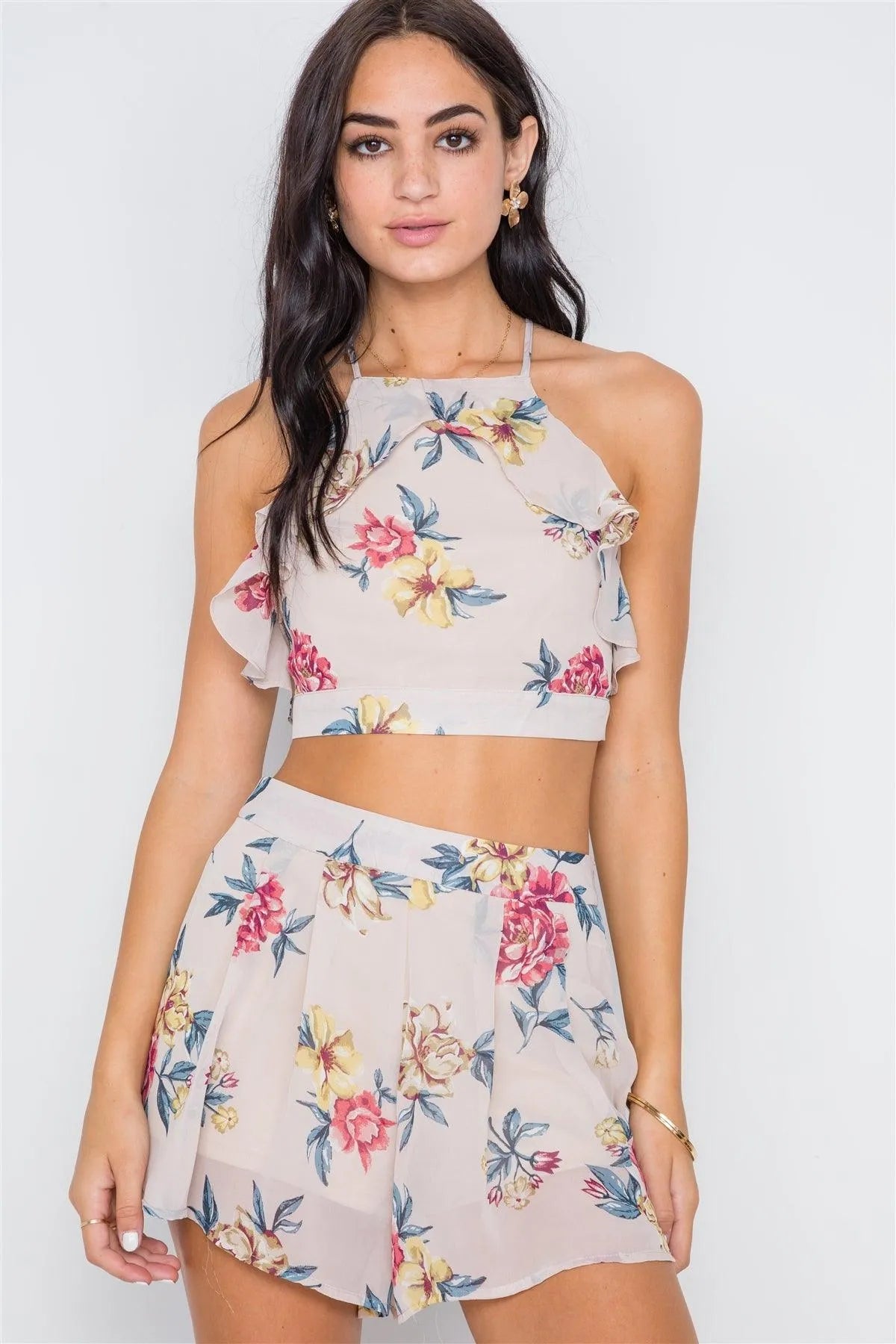 Two Piece set features:Top features: cami straps, halter neck, self tie in back, flounce layer, crop length, floral print, linedShort: high-waisted, floral print, hidden back zip closure, lined Model is 5'9 wearing a size Small ( Waist: 26", Bust: 32B, Hips: 34")Item measurements Top: Length: 15", Bust: 30"Item measurements: Length: 16", Waist: 28"