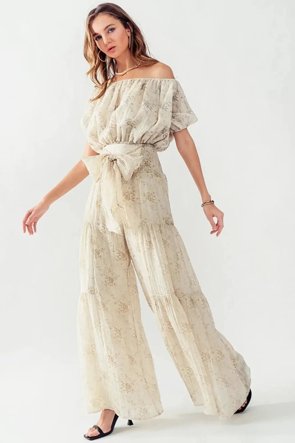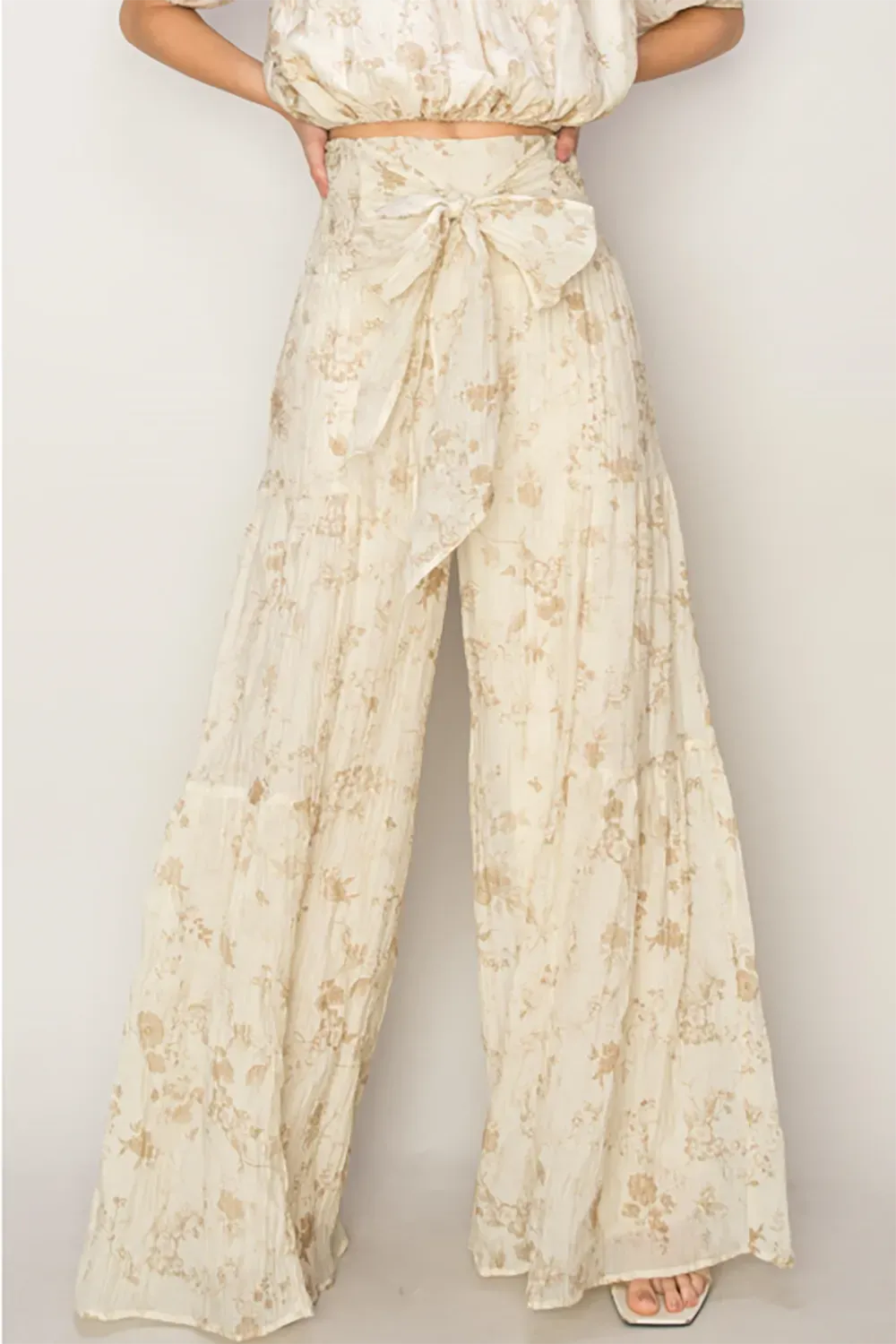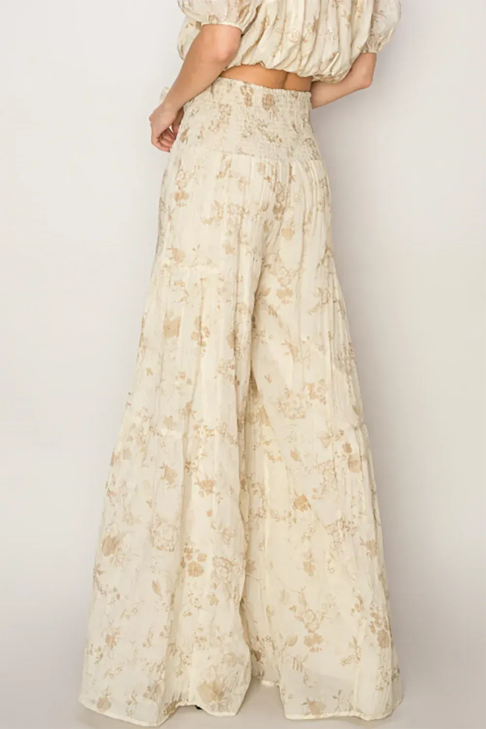Introduce effortless elegance to your boutique collection with our statement palazzo pants in a sophisticated taupe and gold floral pattern. These show-stopping bottoms feature a flattering high-rise smocked waistband, dramatic wide-leg silhouette, and a beautiful tie-front detail that adds feminine charm. The delicate metallic print elevates these pants to special occasion status while maintaining their versatile styling potential.
