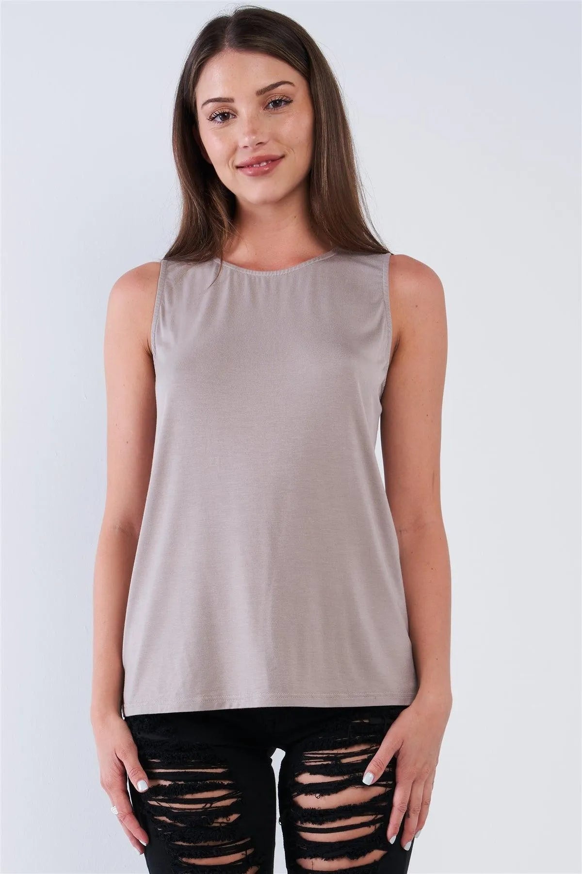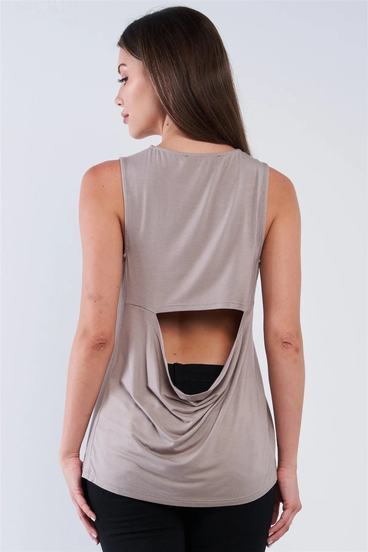 Taupe Cut Out Crew-Neck Sleeveless Casual Tunic Top