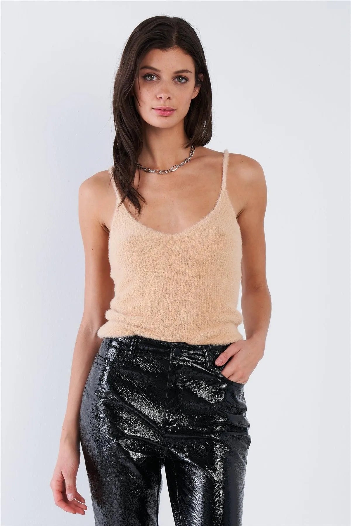 Top features: v-neck, spaghetti straps, hairy, fluffy, vintage, casual, chic, retro, unlined, very stretchy.Item measurements: Length: 15'', Bust: 30"Model is 5'9 wearing a size Small ( Waist: 23.5", Bust: 32B, Hips: 36")Item comes pre-packed with hang tagsTrue to sizeAlso available in Ivory and Black