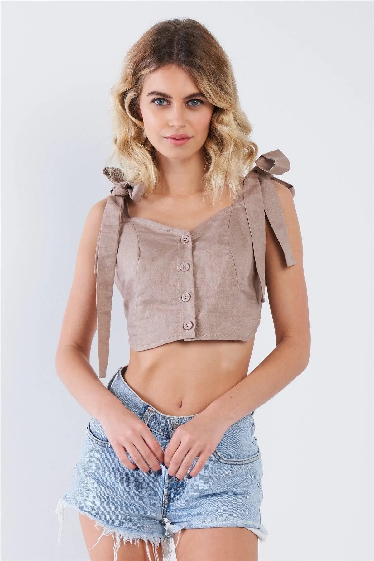 Taupe High Low Self Tie Shoulder Straps Crop Top