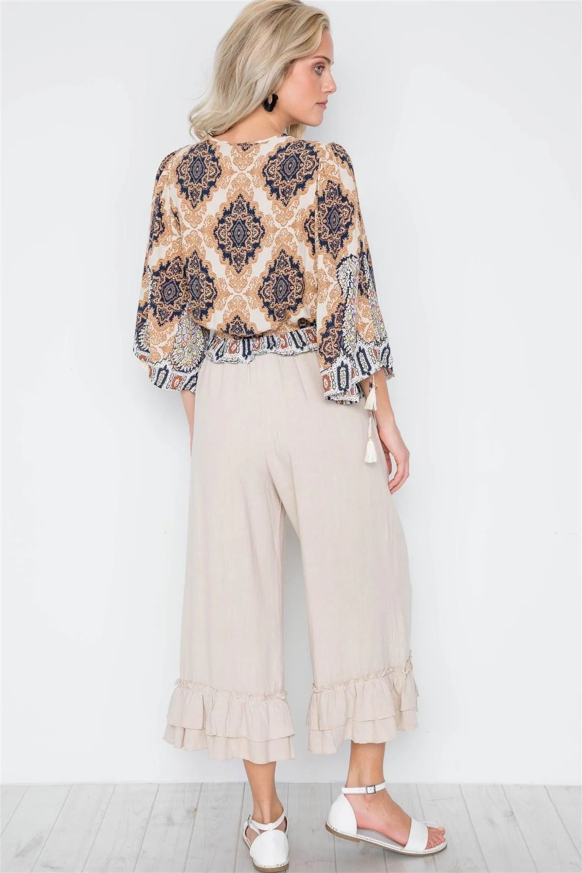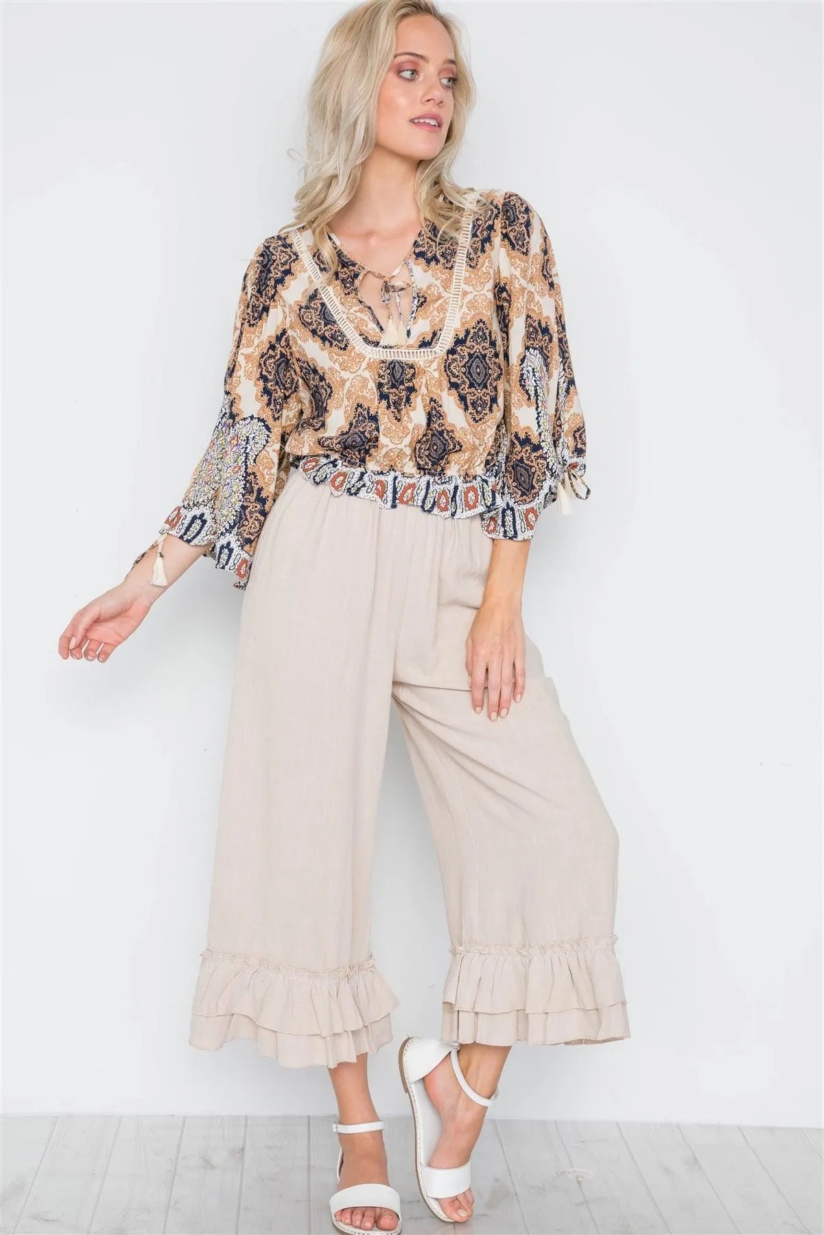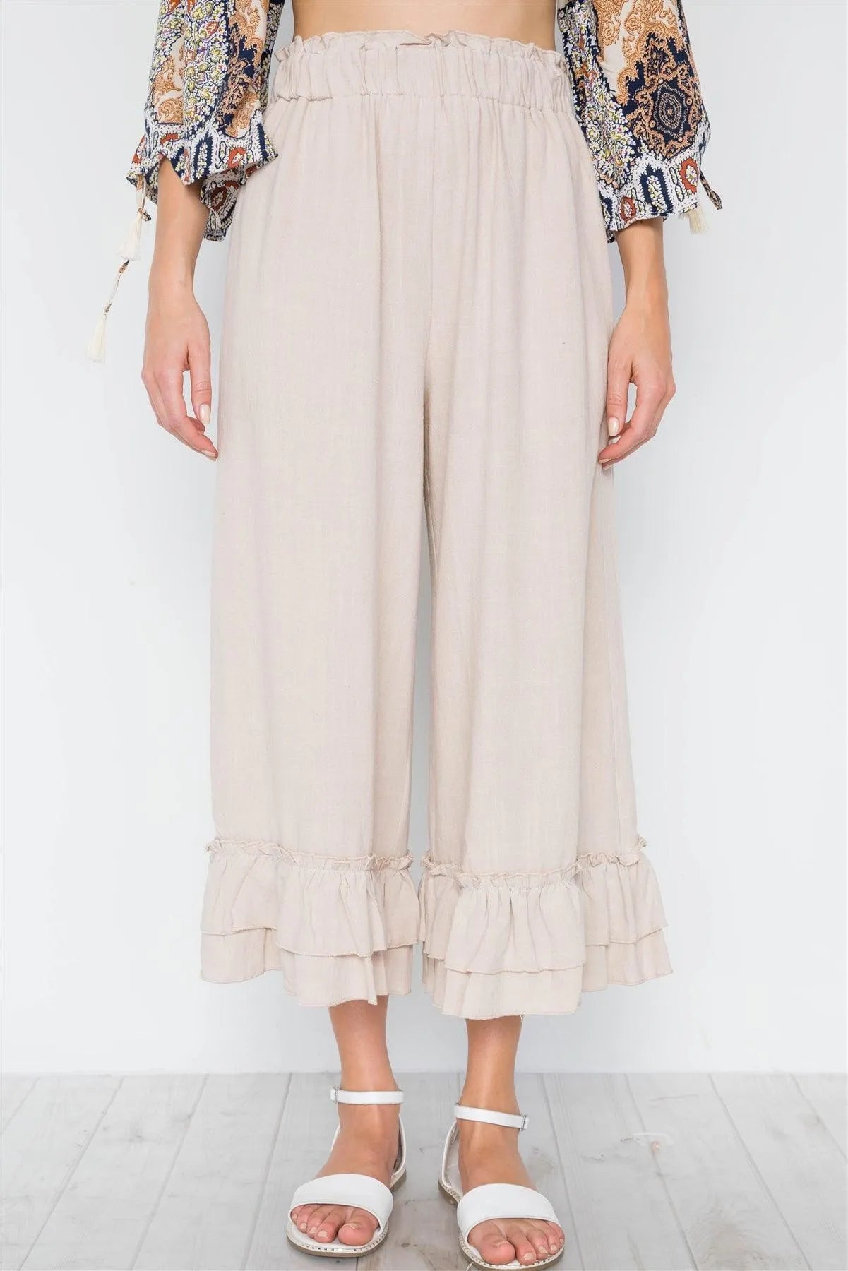 Taupe High-Waist Ruffle Hem Wide Leg Boho Pants /3-2-1