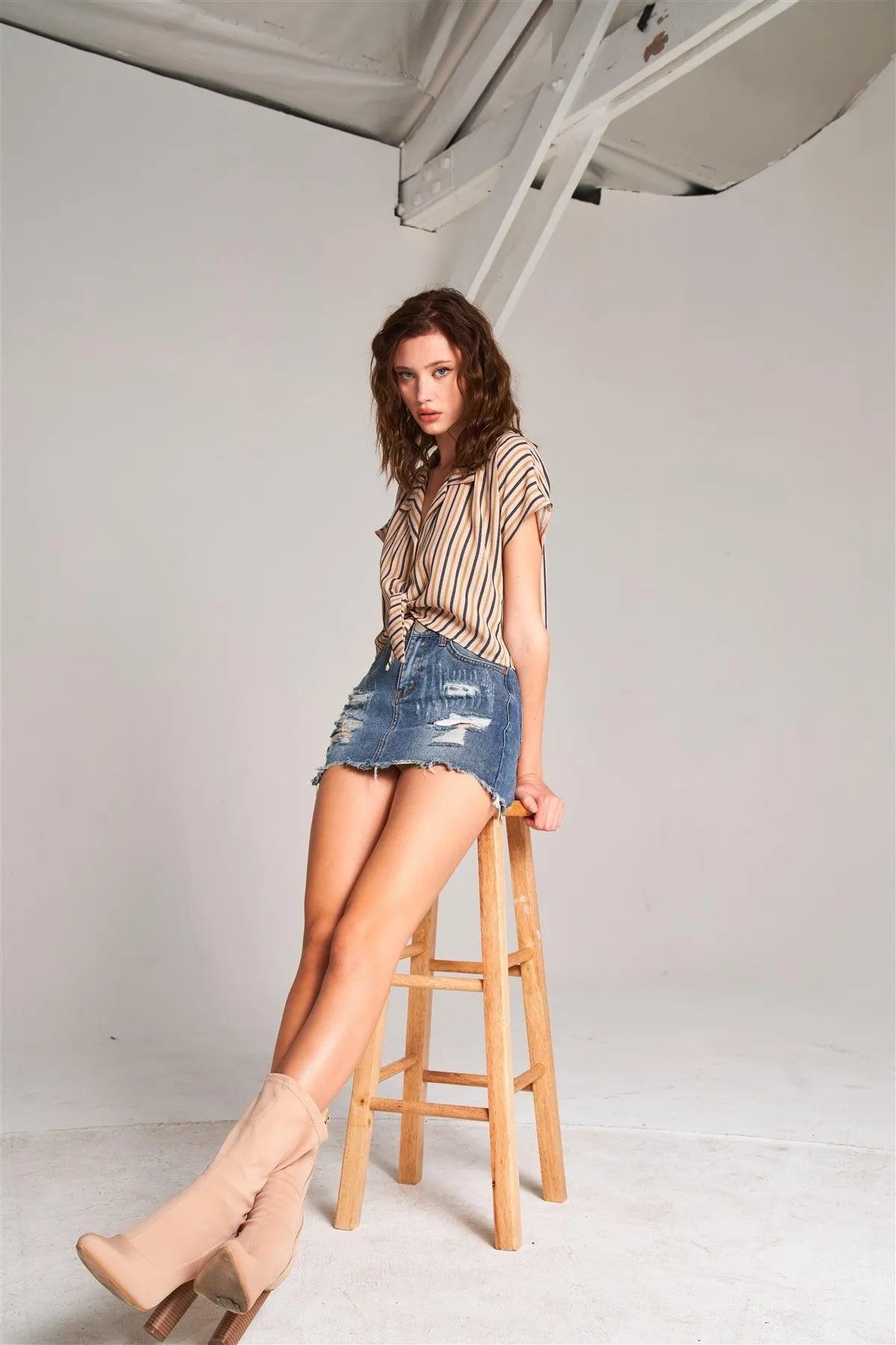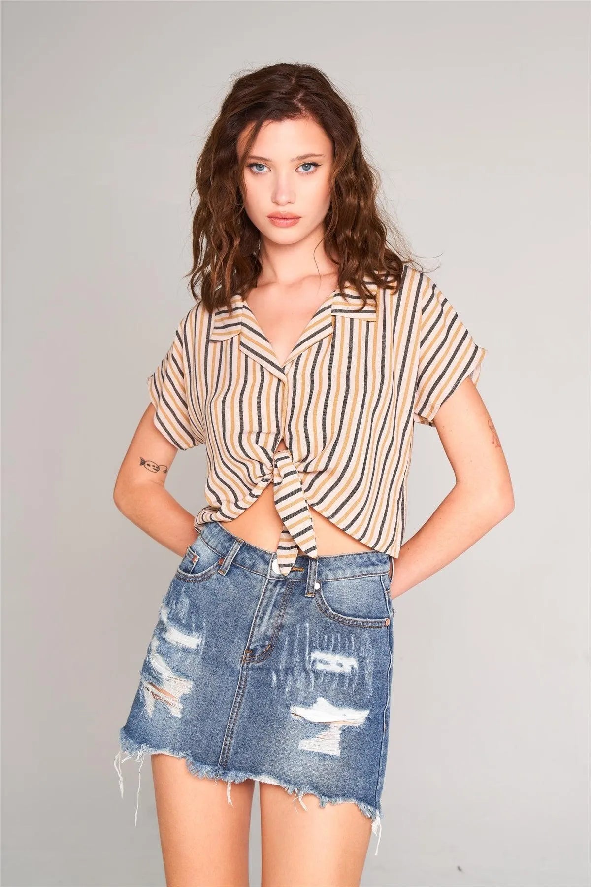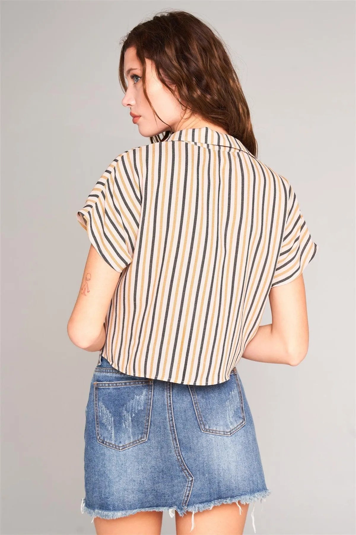 Taupe & Mustard Striped Collared Short Sleeve Self-Tie Front Cropped Top /3-2-1