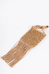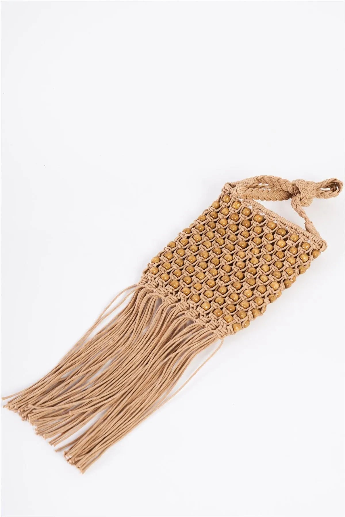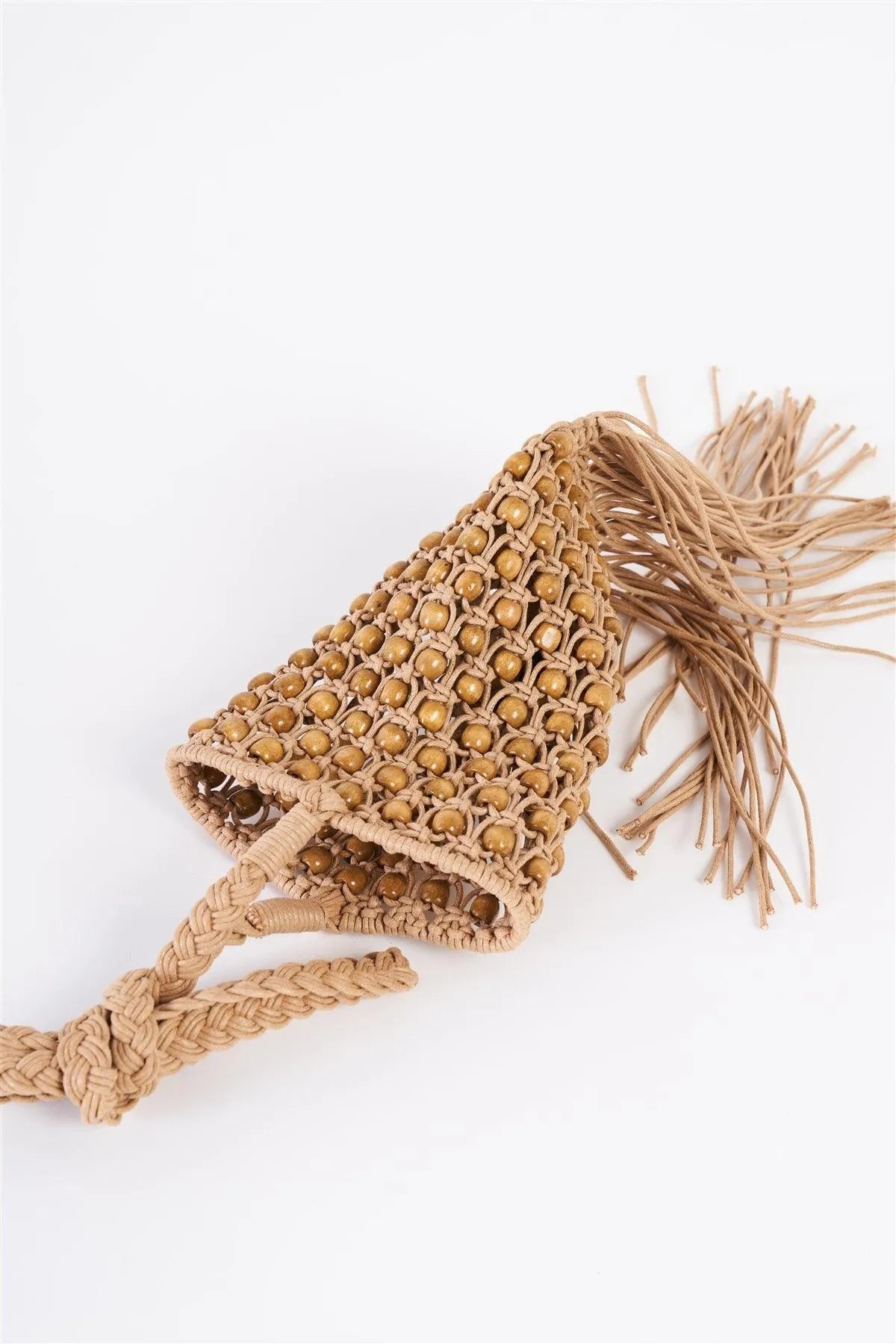 Taupe Net Cable Fringe Wooden Beads Braided Crossbody Bag /3 Bags