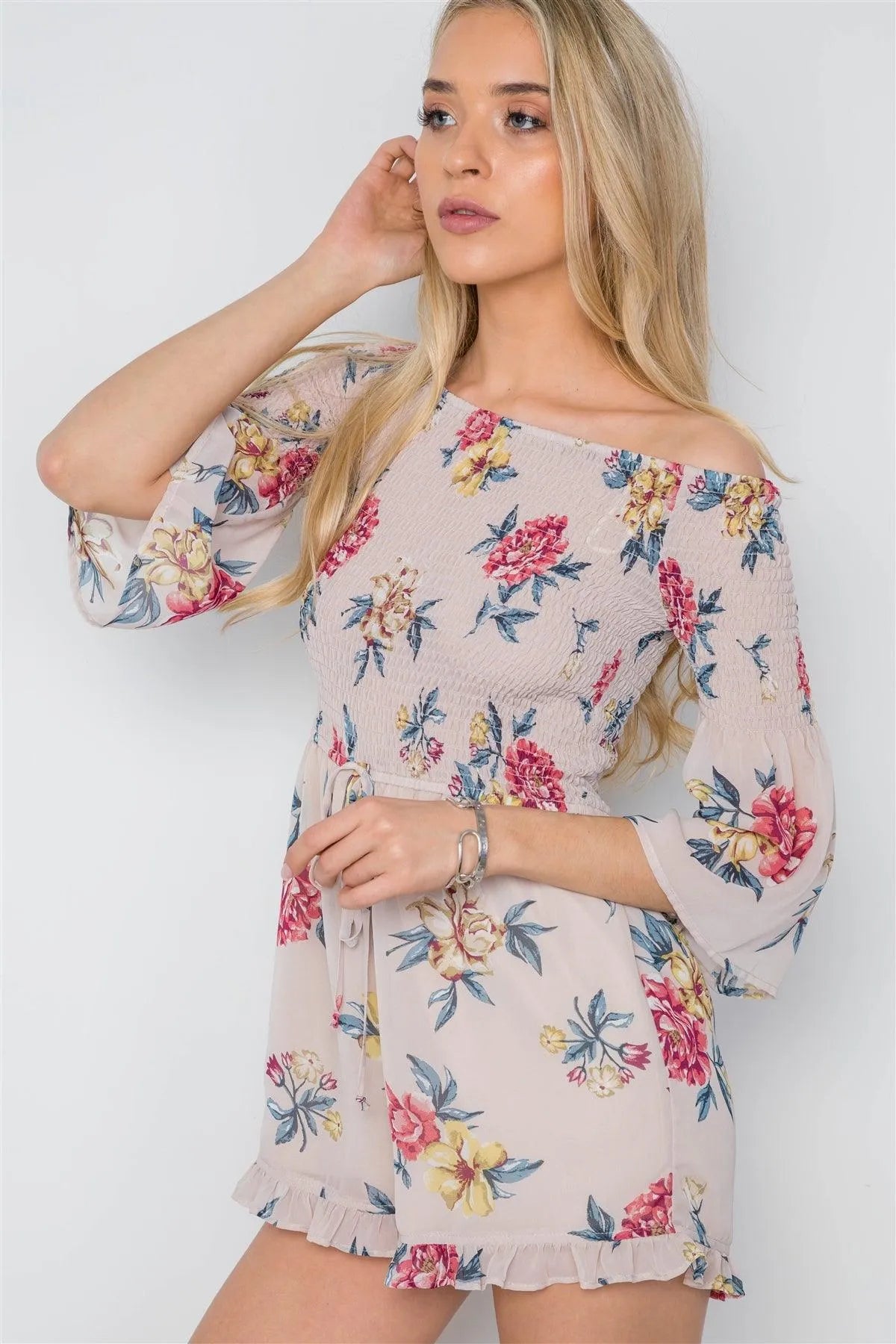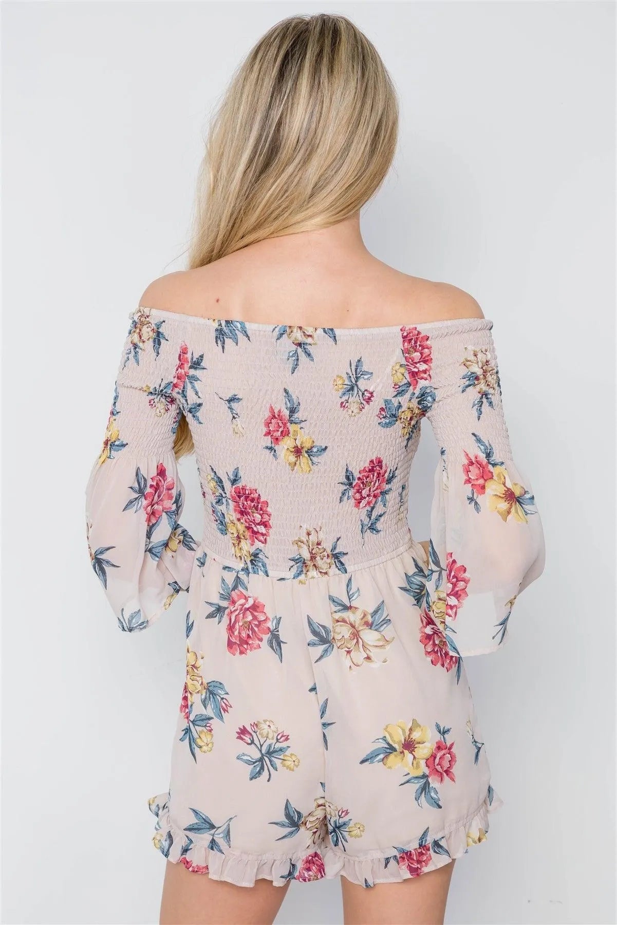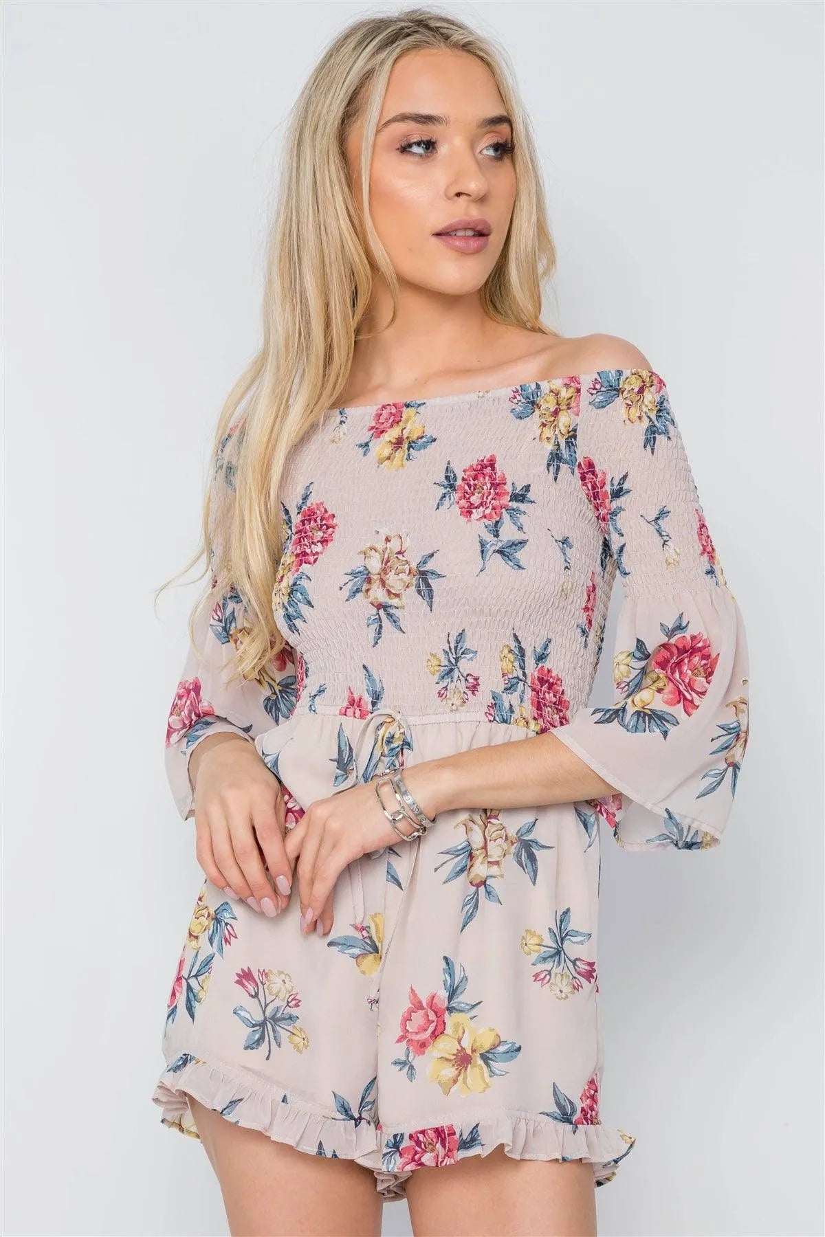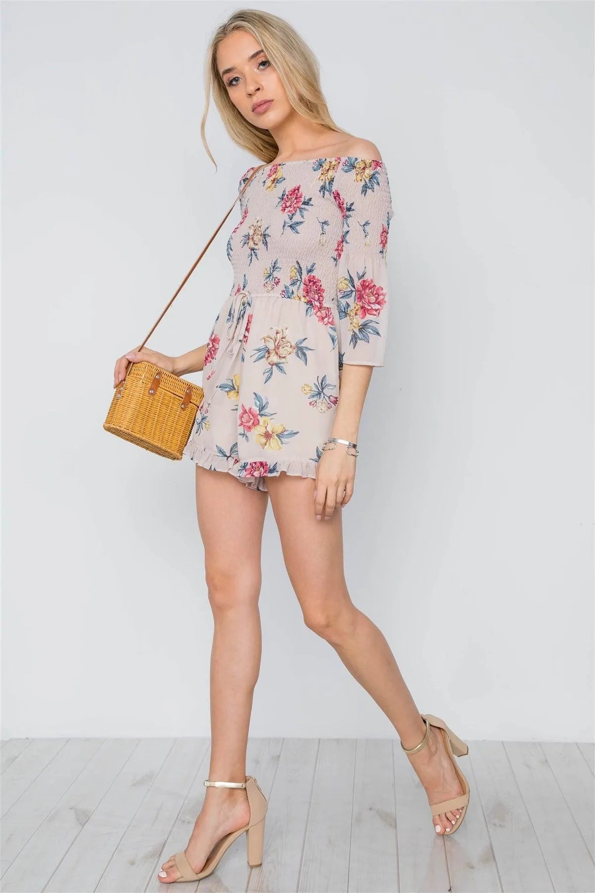Taupe Smocked Floral Print Off-The-Shoulder Romper /2-2-2