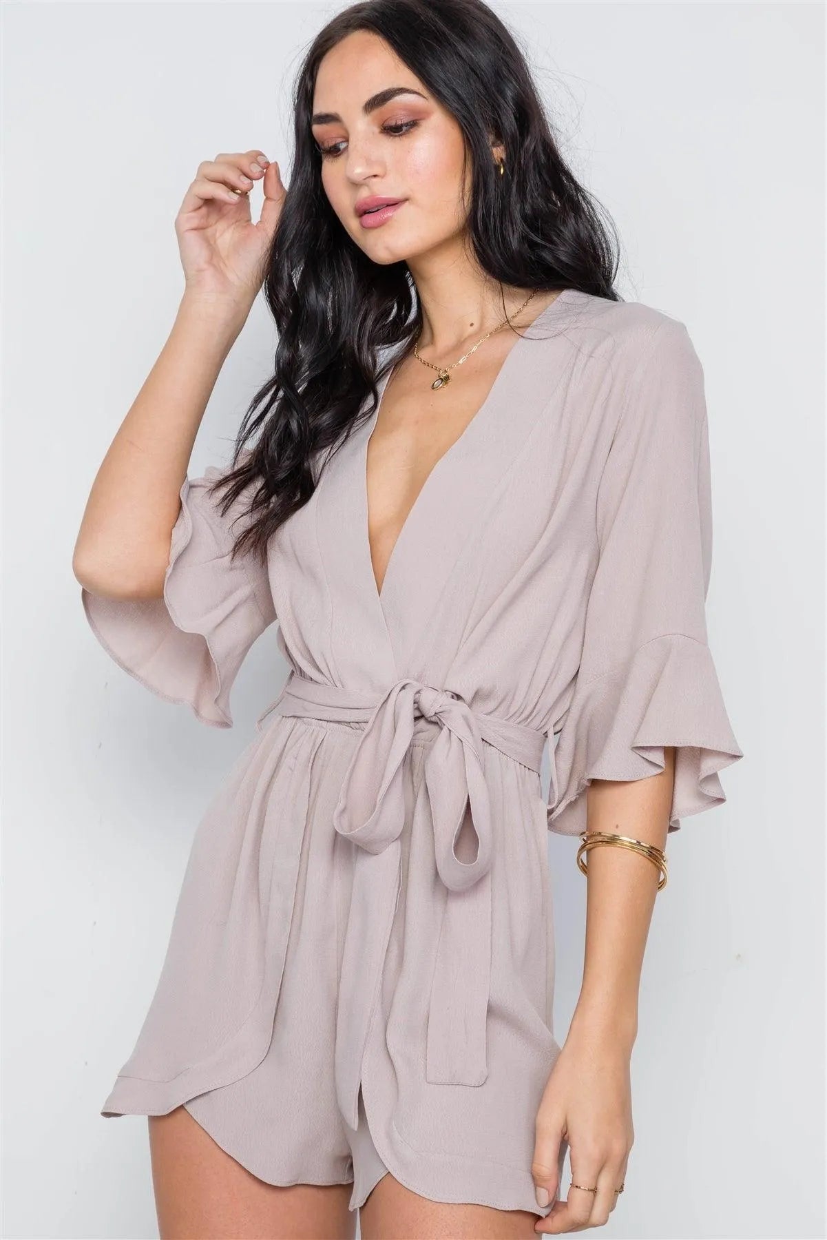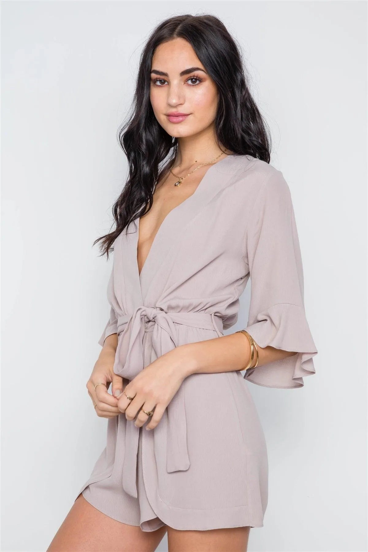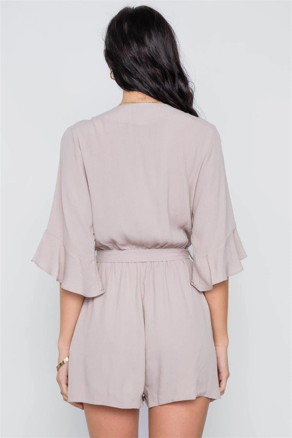 Taupe Surplice V-Neck 3/4 Bell Sleeve Boho Romper / 1-2-2-1