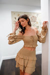 🖤 Item Features: Taupe, solid color, textured material, off-the shoulder design, smocked bodice, ruffle trim, puff balloon long sleeves, self-tie sleeve & front details top, smocked waistline skirt, ruffle detail hem, mini length, unlined, semi-stretchy, non-sheer, casual, chic, trendy, LA vibe style, cute, girlish
