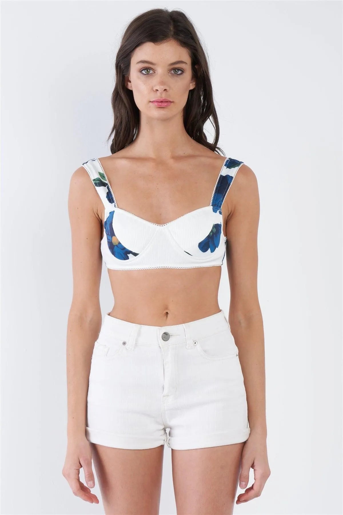 Bra Features: full support, wire cup bra, lace trim, solid white, floral print on side and shoulders, clasp back, lined, stretchy.Model is 5'9 wearing a size Small ( Waist: 23.5", Bust: 32B, Hips: 36")Item Measurements: Length: 11" , Bust: 26"Item comes pre-packed with hang tagsTrue to size Also available in Blush