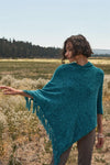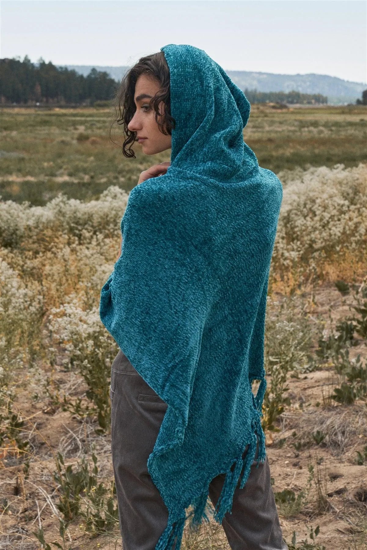 Teal Blue Chenille Knit Tassel Fringe Hooded Poncho