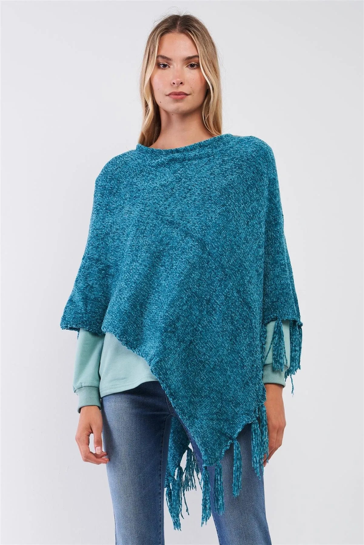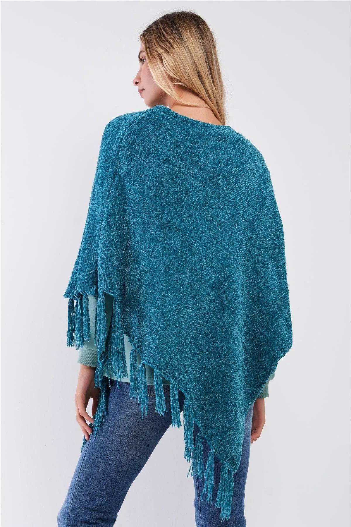 Teal Chenille Knit Tassel Fringe Side Trim Poncho /ONE SIZE