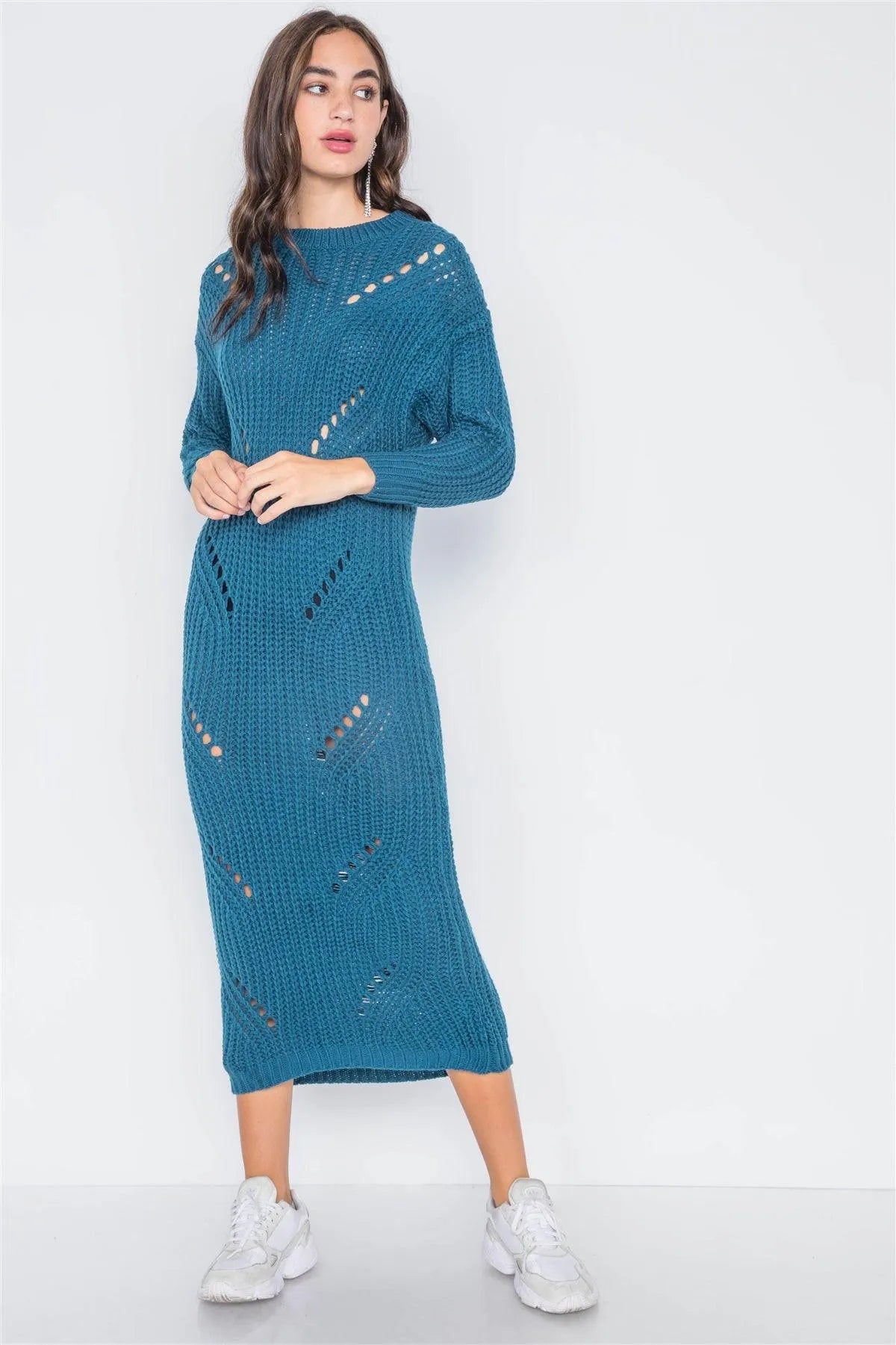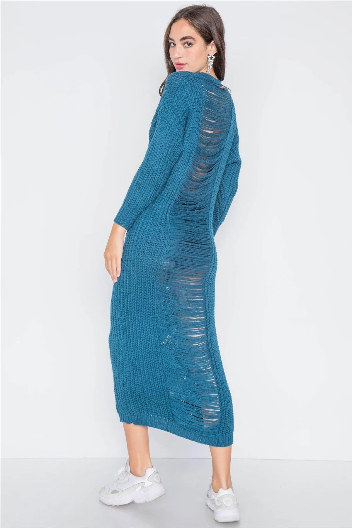 Sweater Dress features: long sleeves, round neck, distressed detailing at back, chunky knit, dropped shoulders, midi length, slightly sheerModel is 5'9 wearing a size Small (Waist: 24", Bust: 32A, Hips: 34")Size Small Item Measurements: Length: 52", Bust: 36", Sleeves: 38"True to size