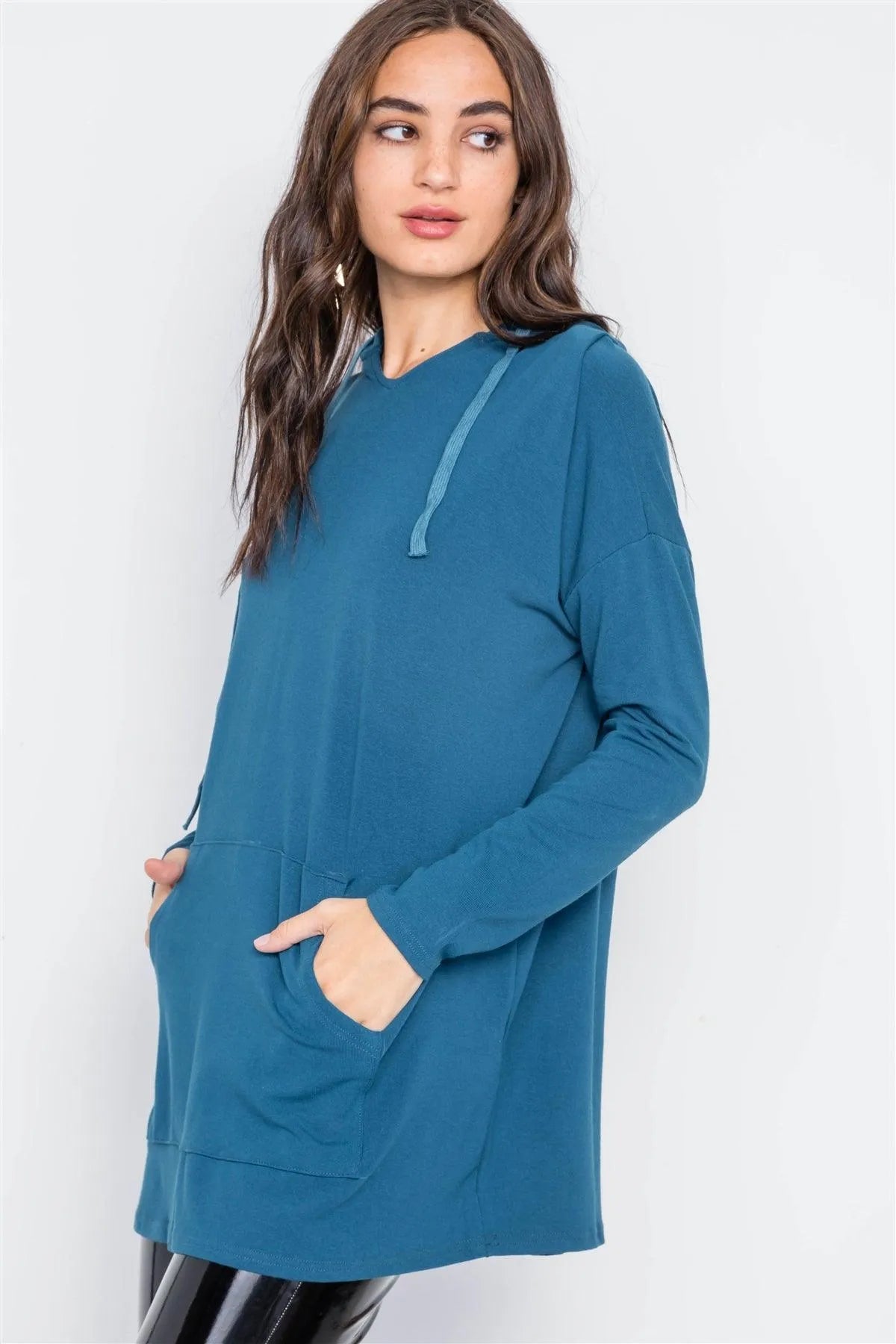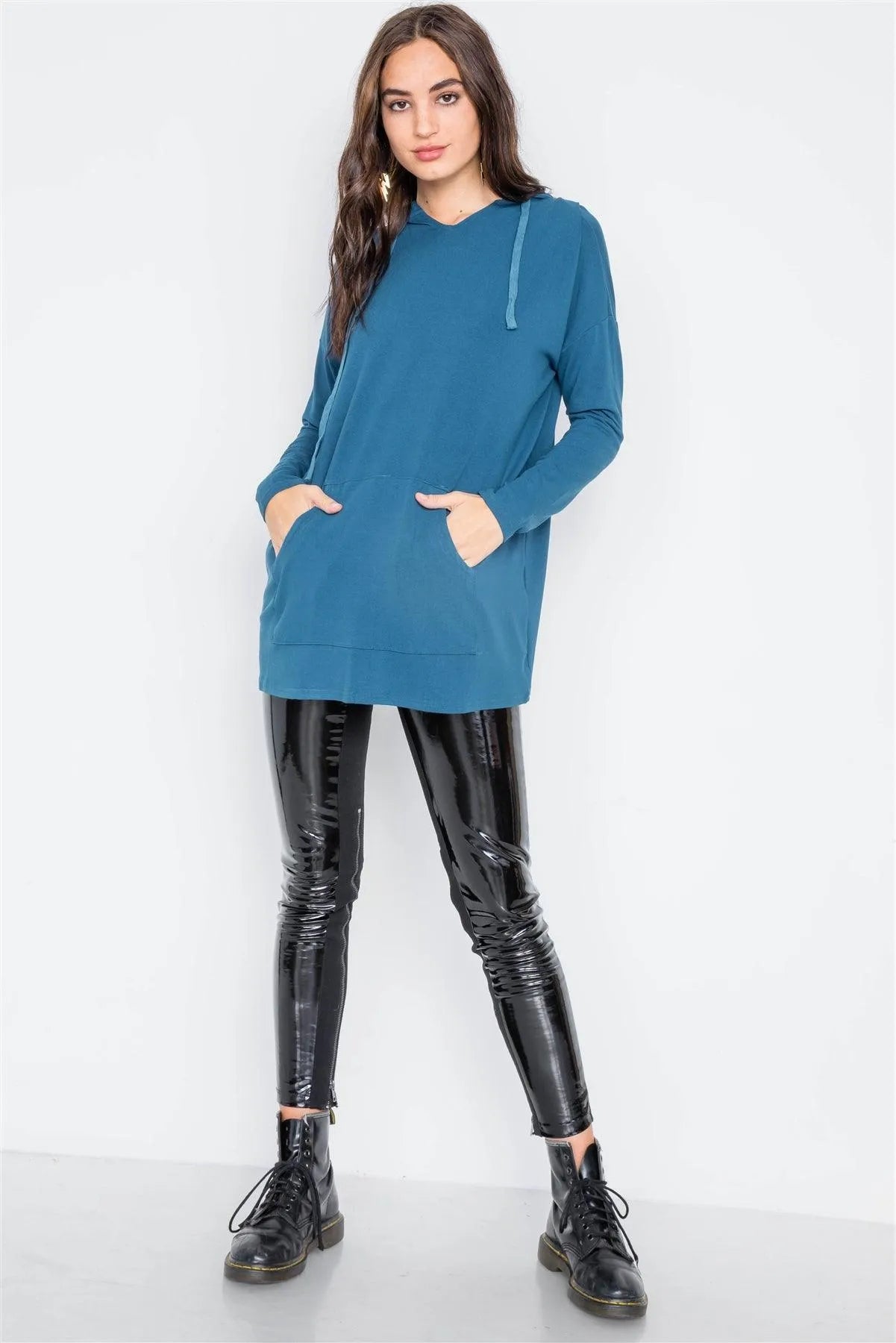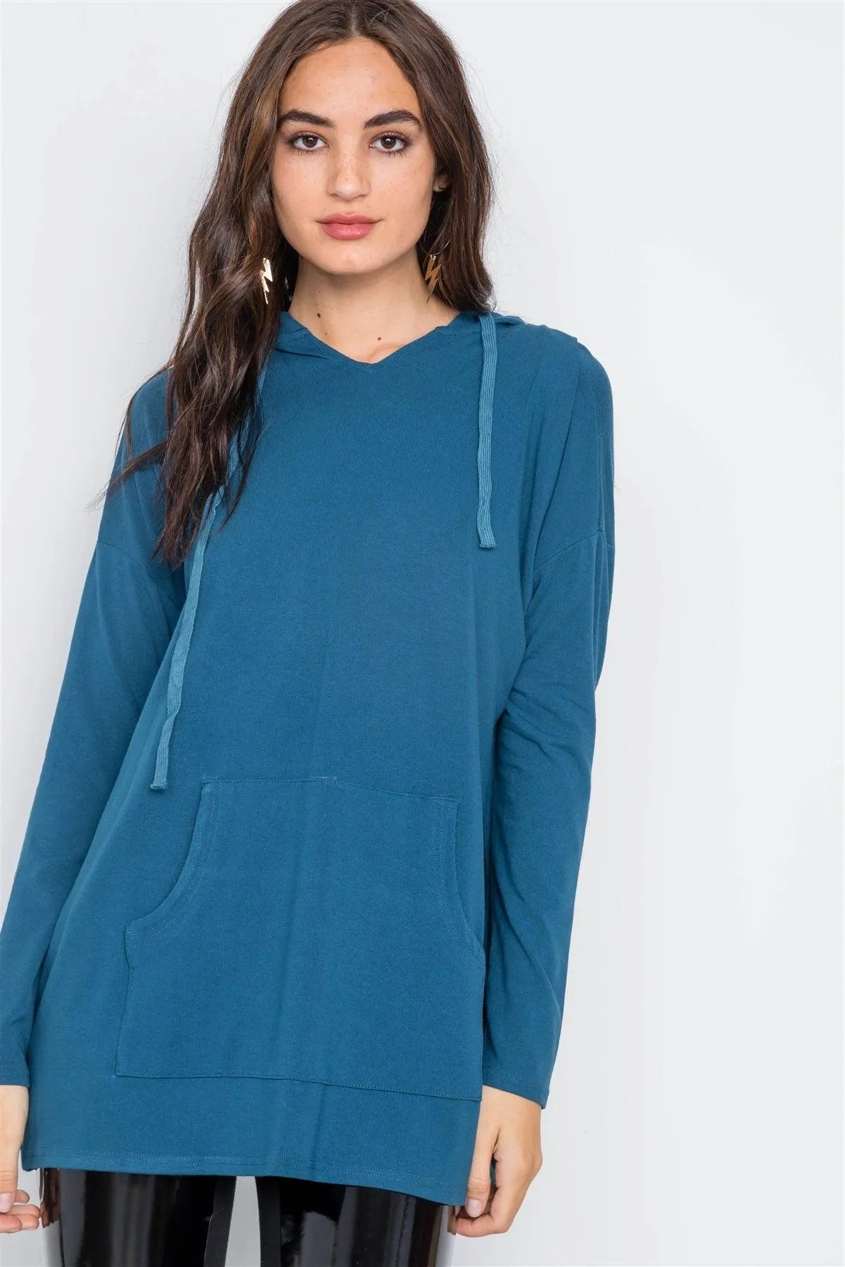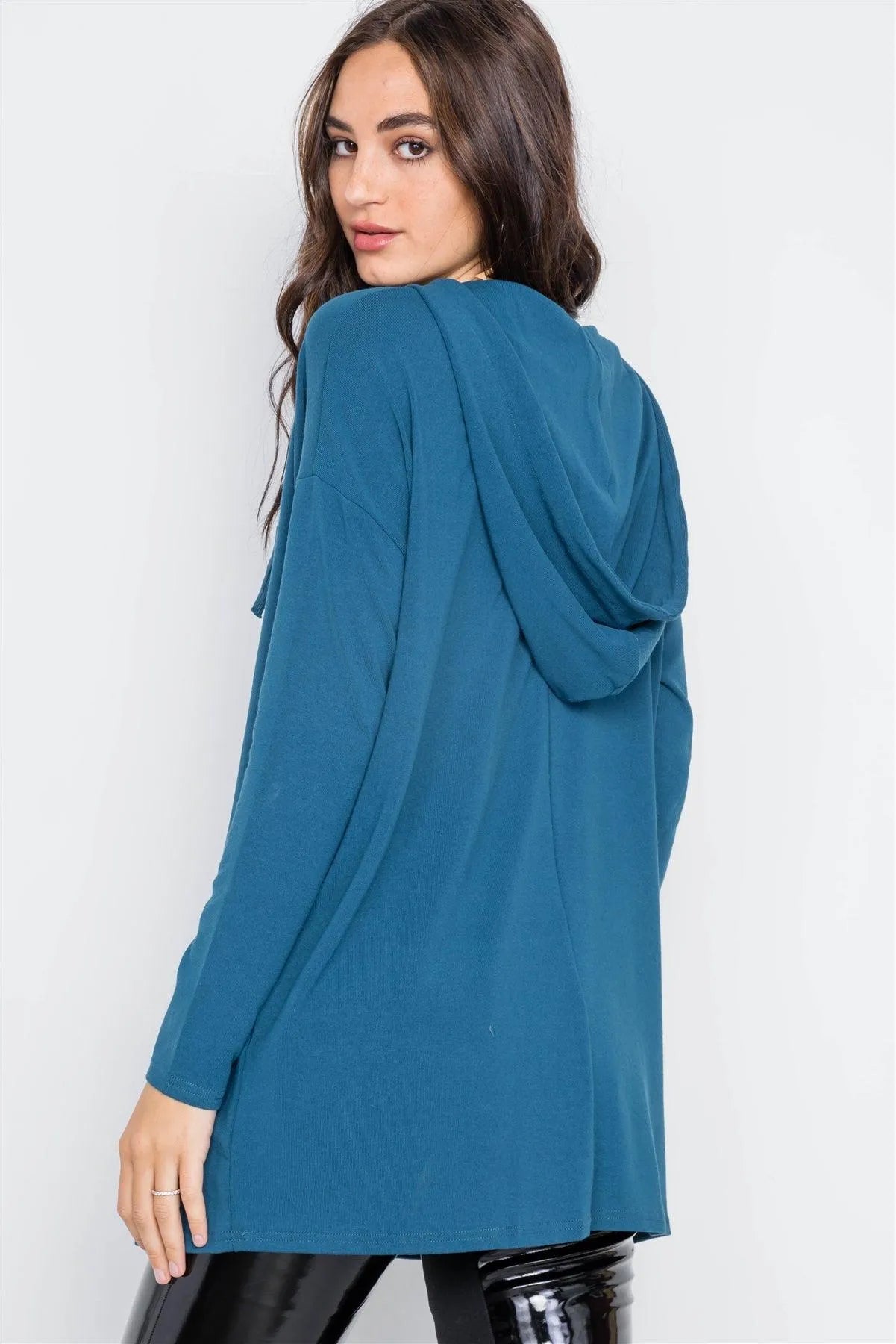 Teal Knit Long Sleeve Hooded Solid Sweater /2-2-2