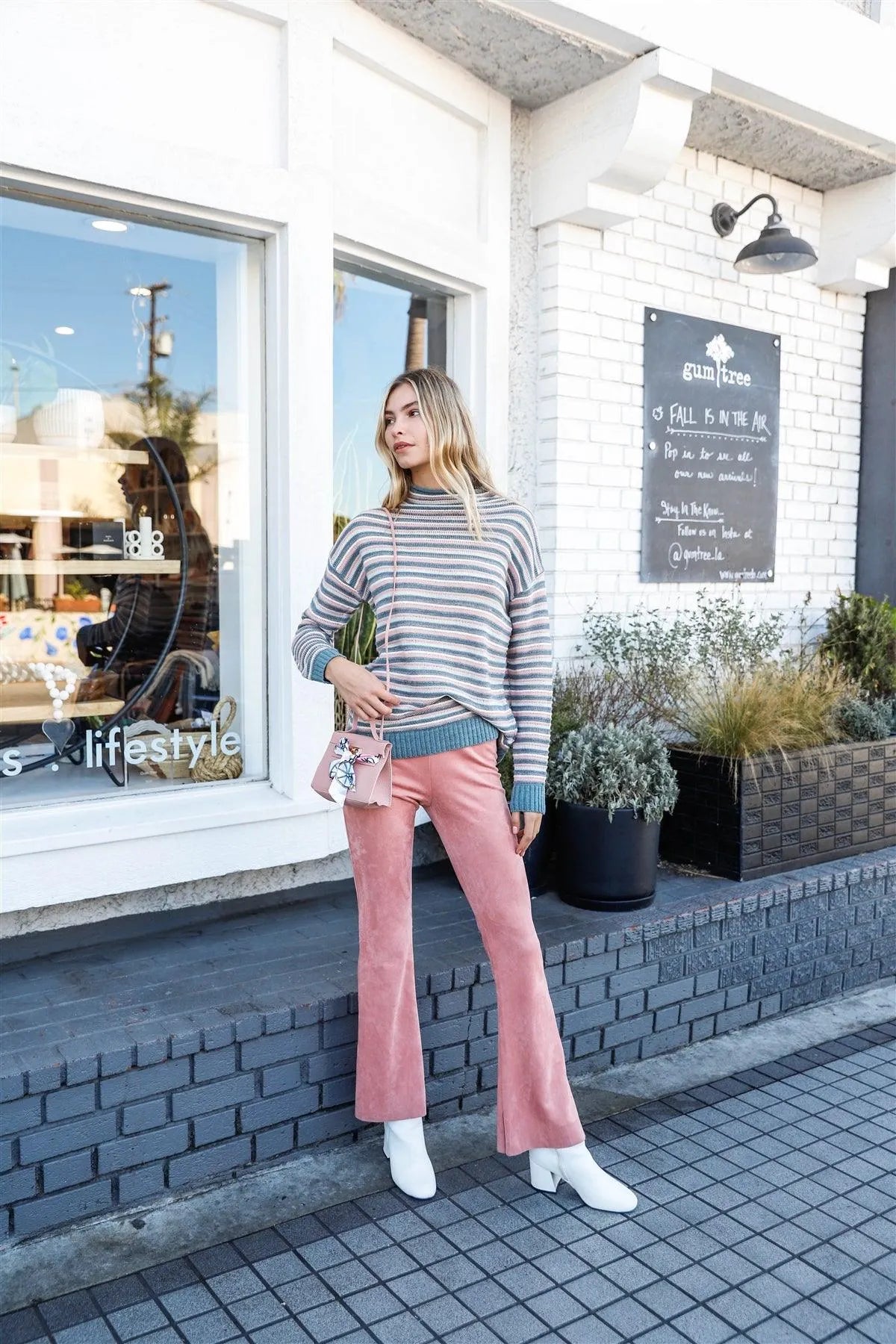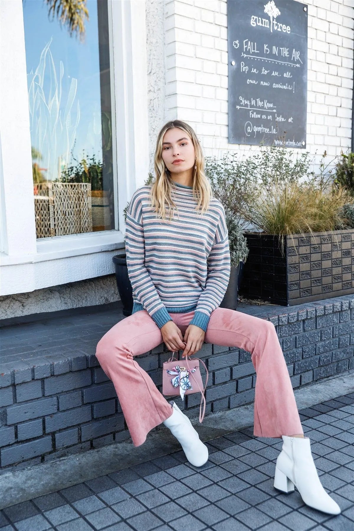 Teal Pink Multi Woolen Striped Turtle Neck Long Sleeve Loose Fit Multi-Knit Sweaters /3-2-1