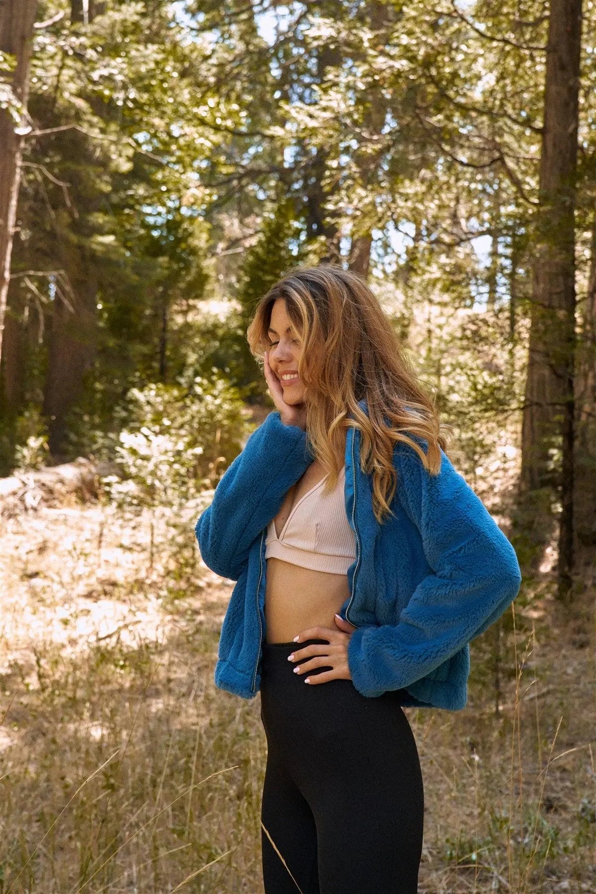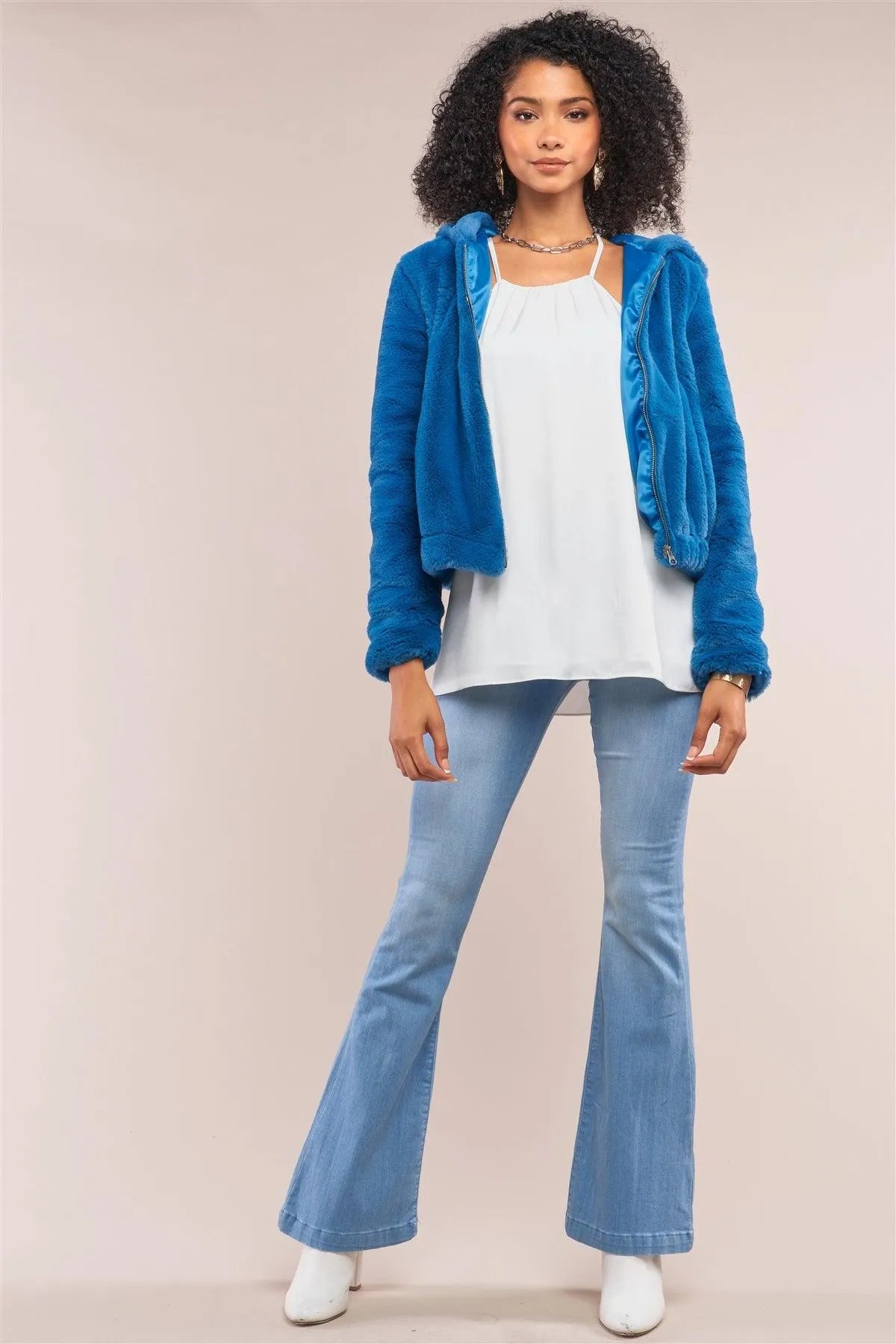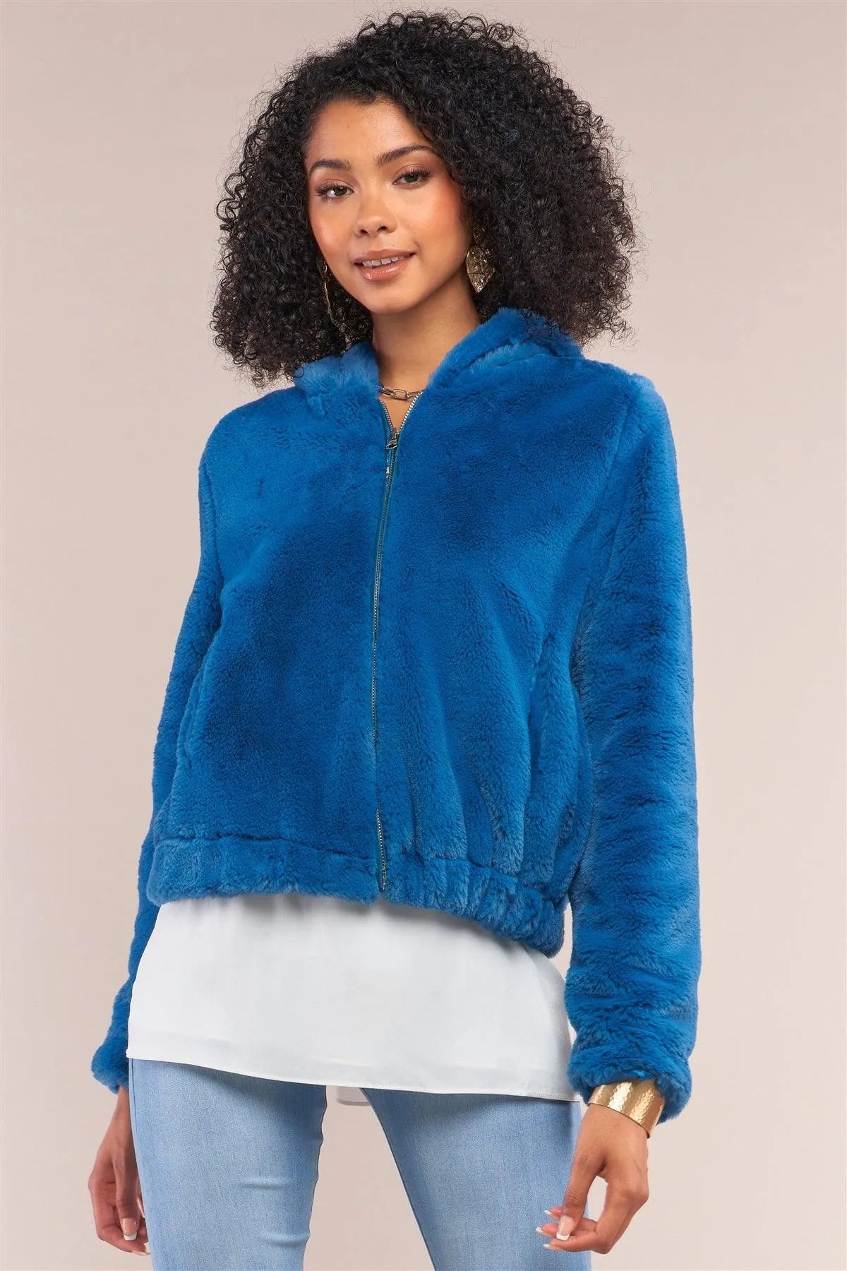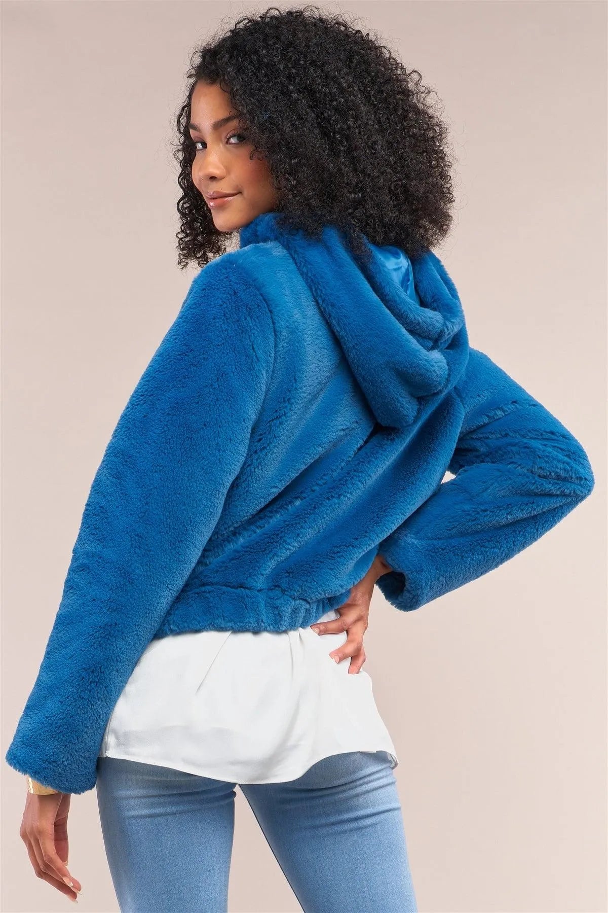 Teal Soft Faux Fur Hooded Zip-Up Jacket /4-2