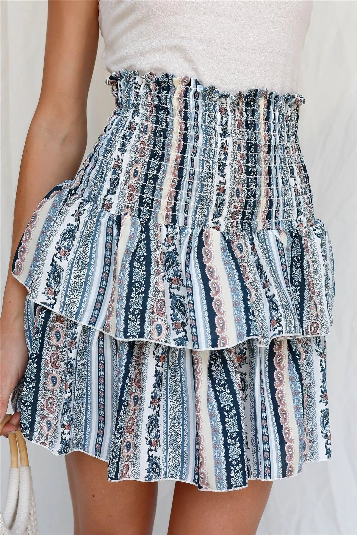 🖤 Item features: Teal taupe, paisley print, flare hem, smocked waistline, super high waist, ruffled, mini length skirt, non-sheer, lined, semi-stretchy, casual, cute, girlish, trendy, stylish, spring/summer collection