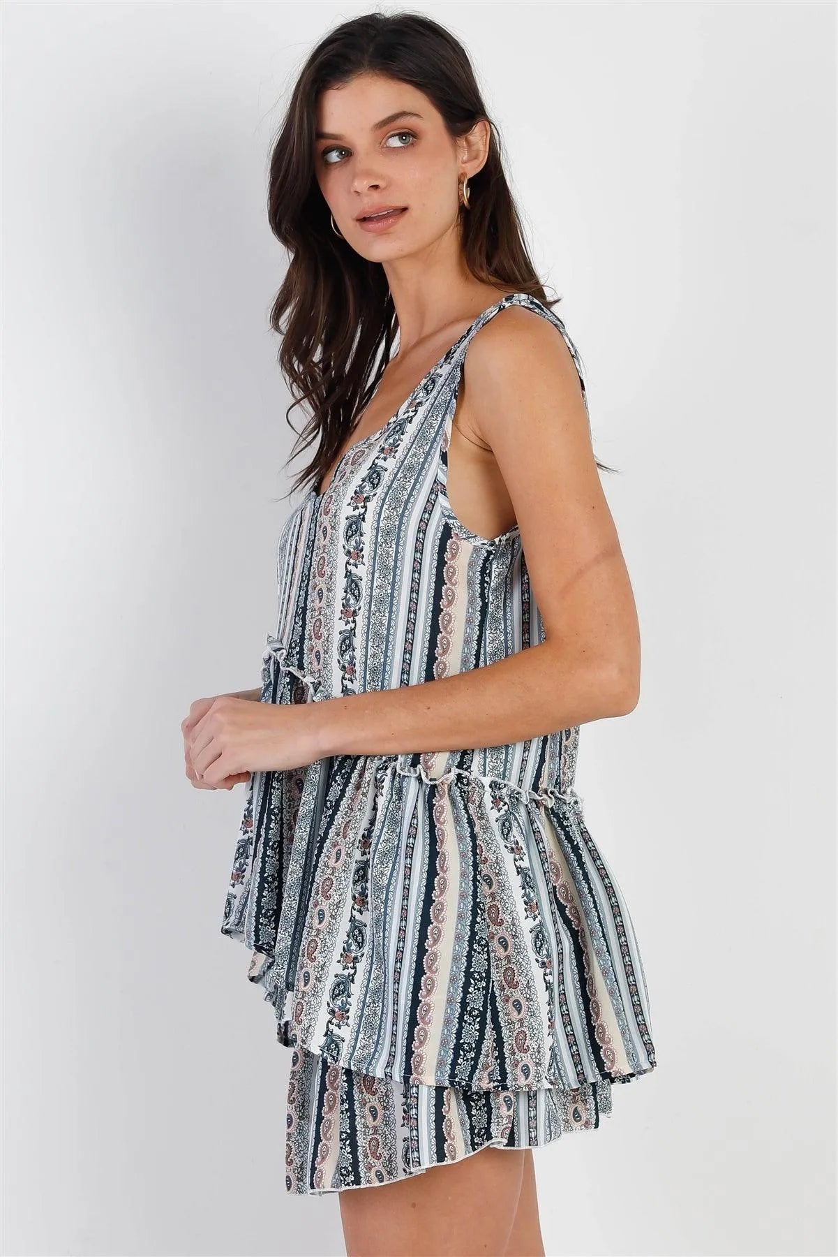 Teal Taupe Paisley Print Flare Hem Sleeveless Top & Smocked Ruffled Mini Skirt Set /2-2-2